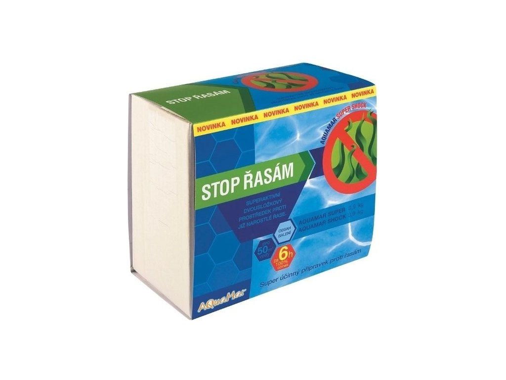 AQuaMar Super Shock je superaktívny dvojzložkový prostriedok proti už narasteným riasam. Bublinky stúpajúce k hladine strhávajú a nabaľujú na seba riasy a vynášajú ich so sebou na hladinu. Zničené riasy z hladiny odstráni skimmer.