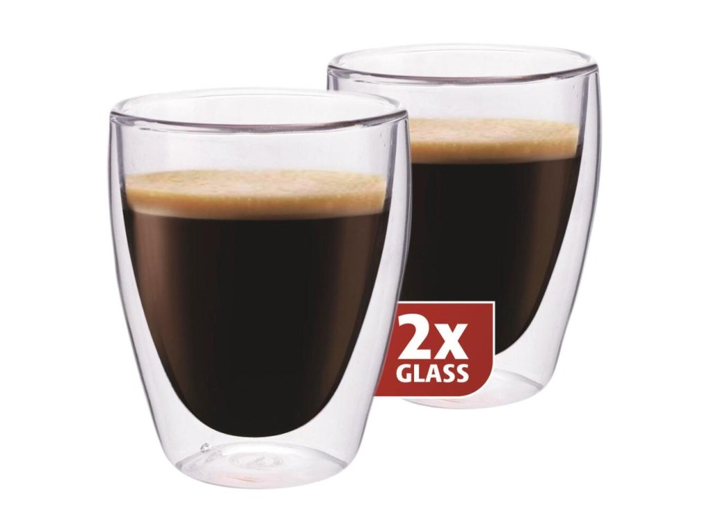 Termo poháre s objemom 235 ml. Dvojité Termo borosilikátové sklo udrží dlho požadovanú teplotu nápoja. Poháre sa vyznačujú moderným dizajnom a dobrou odolnosťou voči vysokým a nízkym teplotám. Sú vyrobené zo silného borosilikátového skla, ktoré je odolnejšie proti tepelnej deformácii než bežné sklo, preto sa môžu používať aj v mikrovlnnej rúre a bezpečne umývať v umývačke riadu.