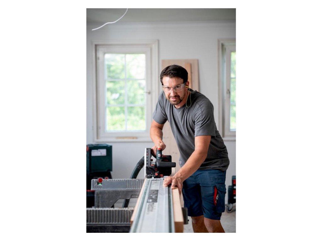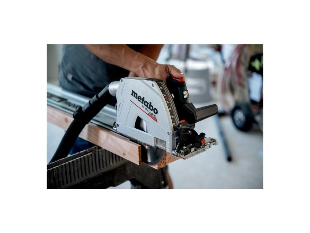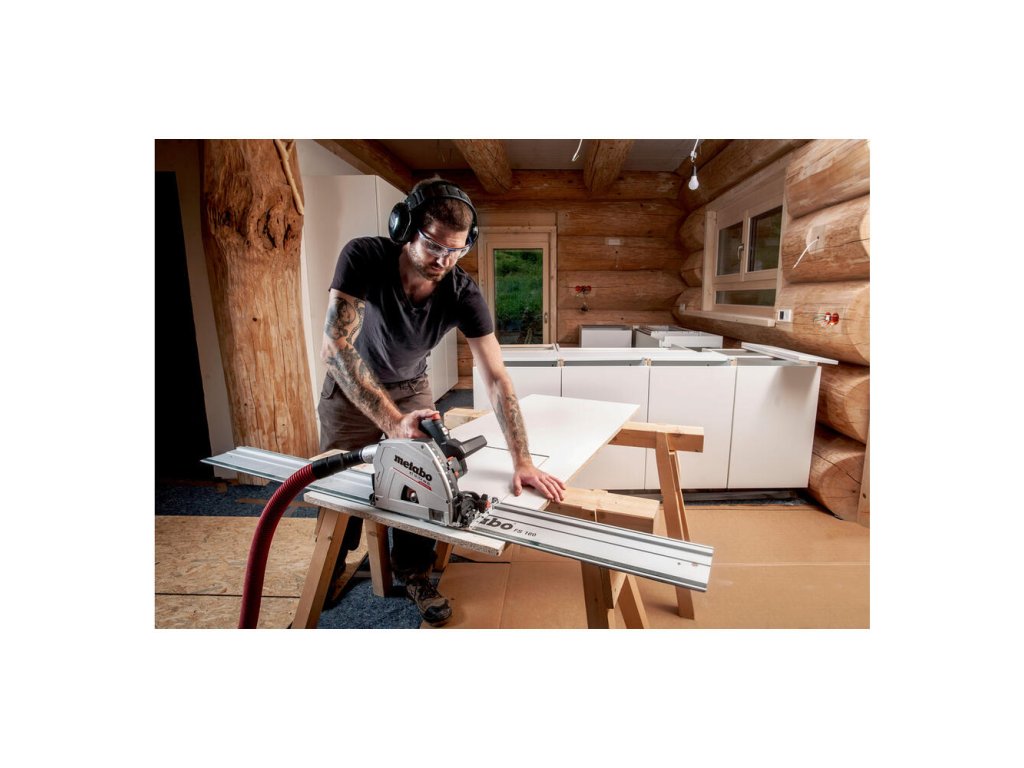 - Nastaviteľné uloženie na vodiacich lištách od Metabo a iných výrobcov pre presné výsledky rezania bez vôle