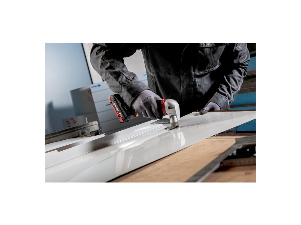 - Veľmi šikovné a obratné akumulátorové nožnice na plech, ktoré strihajú bez zanechávania ostrapkov.