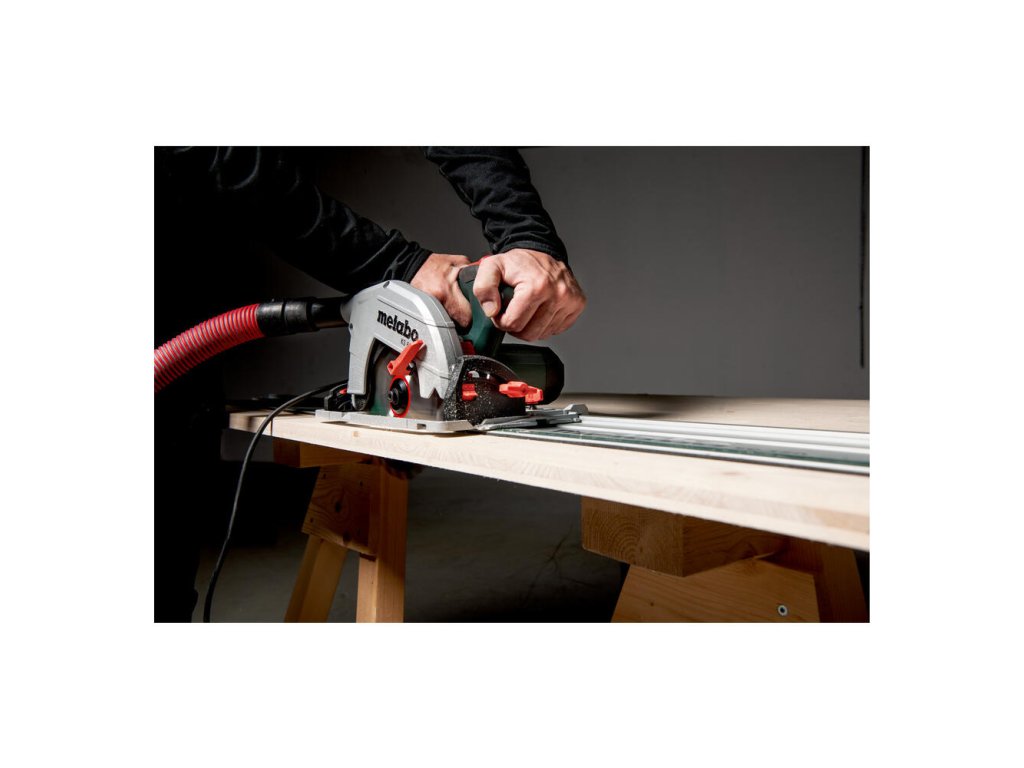 - Robustná ručná kotúčová píla, priamo použiteľná na vodiacich lištách od firmy Metabo a iných výrobcov na presné, dlhé rezy.