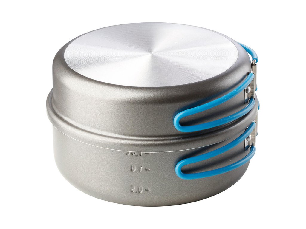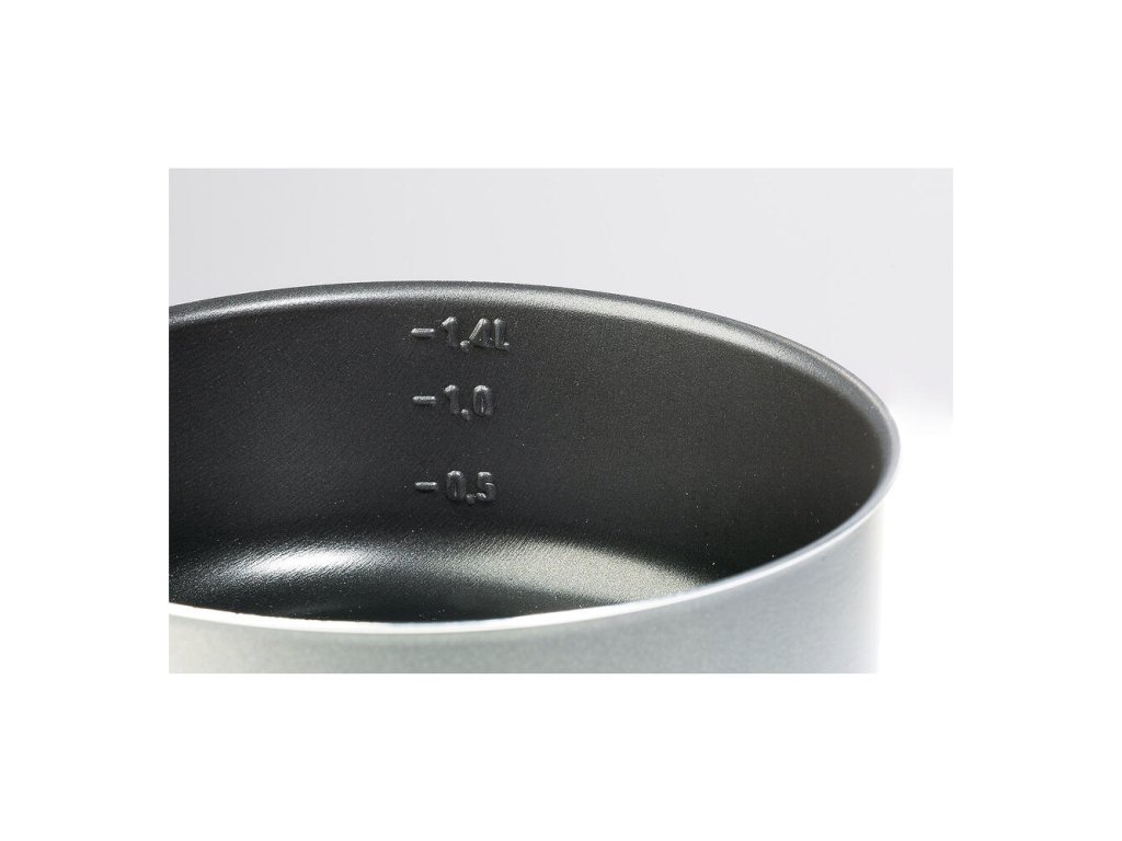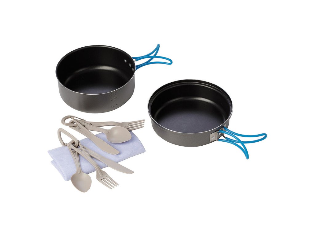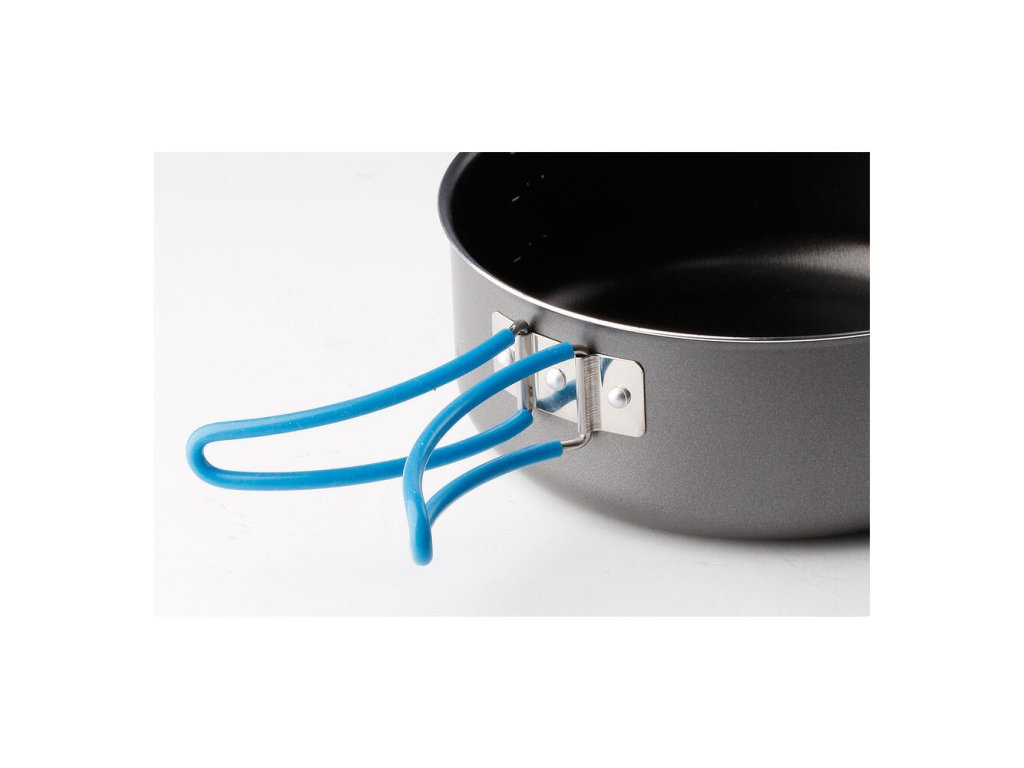 Kempingová sada s nepriľnavým povrchom PTFE – vyrobená z povlakovaného hliníka. Vonkajší povrch je nastriekaný špeciálnym povlakom, ktorý sa dobre umýva. Na vnútornom povrchu je nanesená tenká PTFE vrstva, ktorá chráni riad proti pripaľovaniu pokrmu a dobre sa čistí. Panvica aj miska majú sklopné držadlá. Dná panvice aj misky sú vysústružené pre lepšiu stabilitu na variči. K sade sa dodáva utierka a dva polypropylénové príbory.