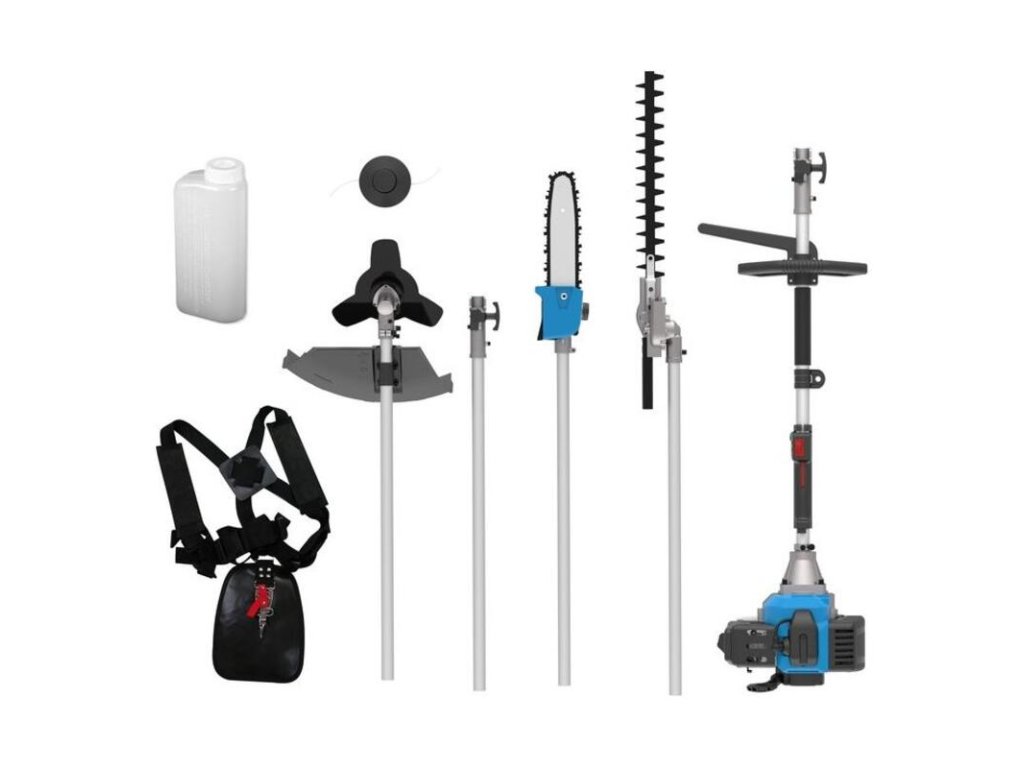 Základom je silná pohonná jednotka s dvojtaktným motorom, ktorá prenáša výkon na vybraný nástroj. Či už potrebujete vyvetvovaciu pílu s lištou Oregon, nožnice na živý plot s výkyvnou hlavou alebo klasický krovinorez, výmena trvá len pár sekúnd. Na mazanie motora používajte zmes benzínu a oleja v pomere 1:40. Súčasťou je aj predlžovacia tyč, vďaka ktorej dosiahnete aj na vysoké konáre bez rebríka.Hlavné vlastnosti a výhody sada GPS 1001 4v1
