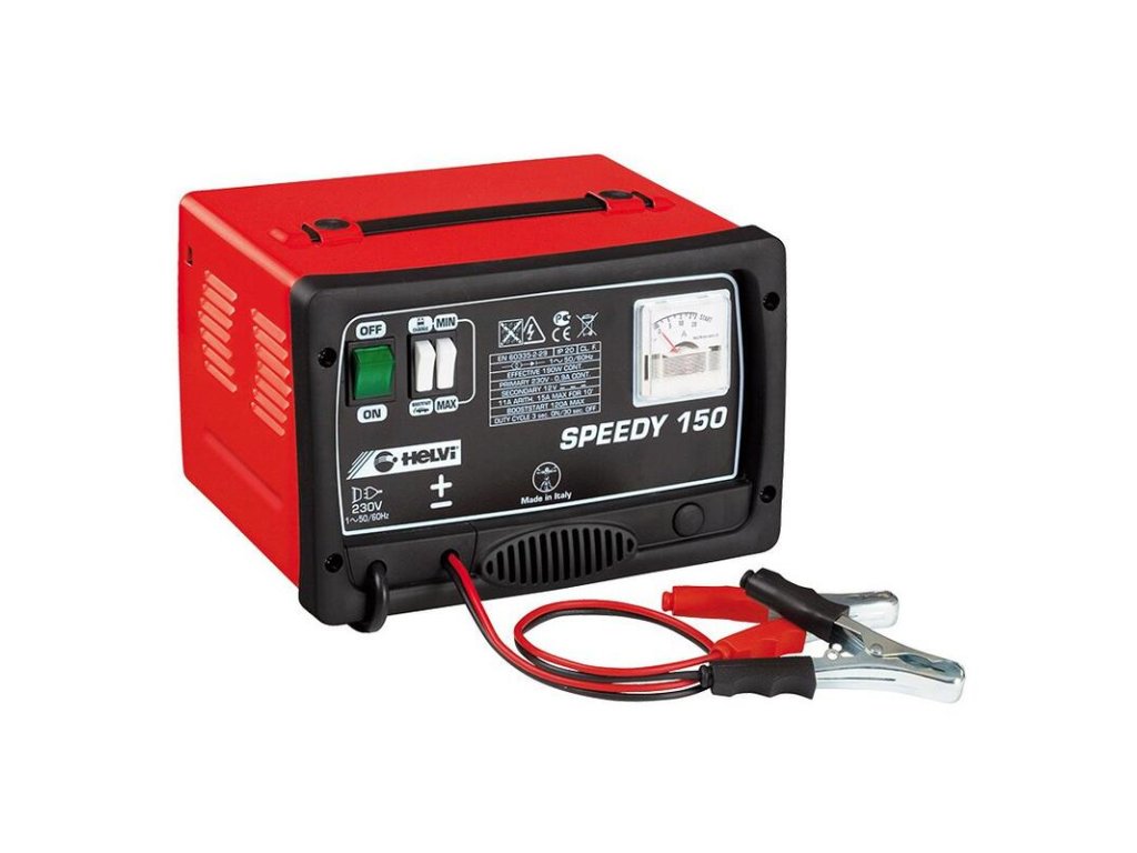 HELVI SPEEDY 150 je prenosná nabíjačka autobatérií s pomocným štartom pre 12V akumulátory s maximálnou kapacitou do 165 Ah. Efektívny nabíjací prúd je 16A.
