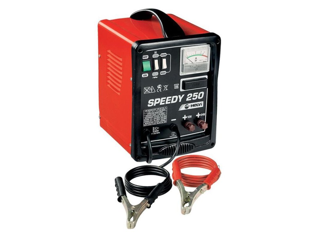 HELVI SPEEDY 250 je prenosná nabíjačka autobatérií s pomocným štartom. Je určená pre 12 alebo 24V akumulátory s maximálnou kapacitou 165 Ah.