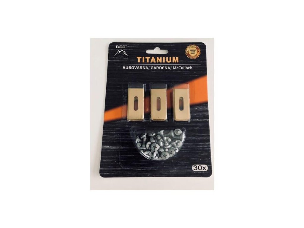 NÔŽ ROBOTICKÝCH KOSAČEK HUSQVARNA GARDENA 35mm TYTAN NEW - SADA 30 ks EVERESTHusqvarna: G1, G2, 105, 210, 220AC, 230ACX, 260ACX, 265ACX, 305, 308, 310, 315, 320, 330X, 330ACX, 420, 430X, 440, 450X; Gardena: R38Li, R40Li, R45Li, R50Li, R70Li, R75Li, R80Li, R100Li, R130Li, R160Li, R165, R180 Silenco, Silenco City, Silenco+, Silenco Smart; McCulloch: ROB R600, ROB R1000; Herkules: G-Froce 1000, G-Froce 1500, G-Froce 2500; FLYMO: 1200R; Telsing: 1000, 1500, 2500