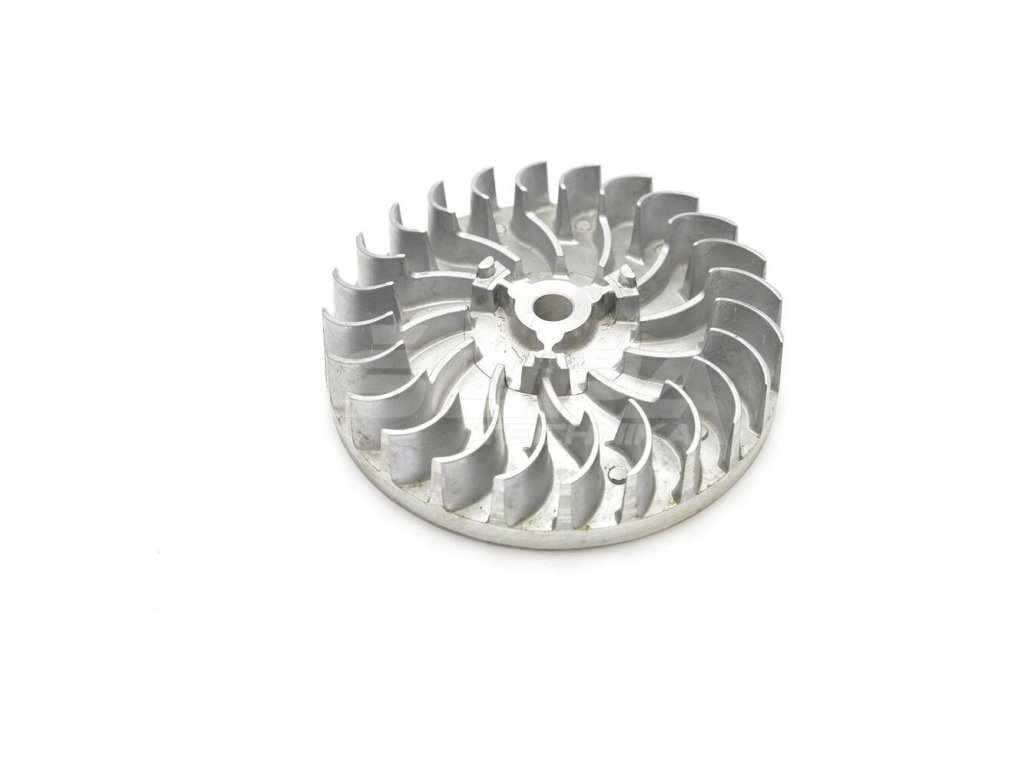 Tento diel plní dvojitú funkciu: lopatky ventilátora vháňajú vzduch pod kryt motora pre účinné chladenie valca a hlavy, a zároveň hmota kolesa slúži ako zotrvačník pre pravidelný chod dvojtaktného motora. Na jeho vrch sa montuje štartovacia miska.Hlavné vlastnosti: