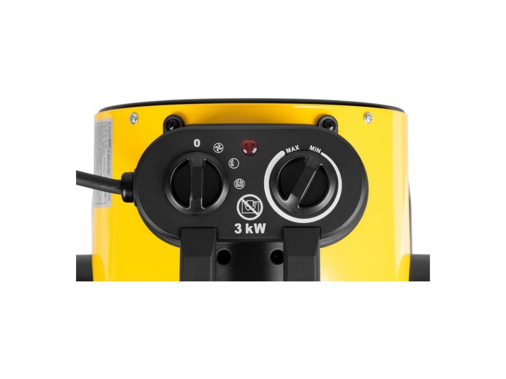 Elektrický ohrievač s výkonom 3000 W umožňuje nastavenie tepelného výkonu: 3 (40 W, 1 500 W, a 3 000 W). Prietok vzduchu dosahuje 304 m3/h. Ohrievač má odolnú konštrukciu s rámom z nerezovej ocele vybavenú ochrannými mriežkami a praktickú rukoväť, ktorá vám uľahčí prenášanie. Je vybavený termostatom proti prehriatiu ohrievača - v prípade, že teplota ohrievača stúpne na 55 °C, termostat automaticky ohrievač vypne. Priestorový termostat udržuje v miestnosti nastavenú teplotu.