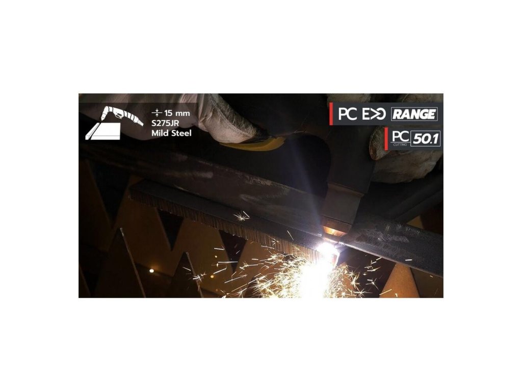 PC EVO 50.1 je jednofázová invertorová plazmová rezačka určená pre rezanie všetkých vodivých materiálov ako sú napr. uhlíková oceľ, nerez, zliatiny a farebné kovy.