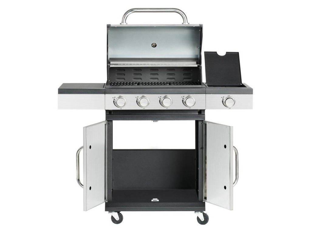 Plynový 4-horákový gril je ideálny na rýchlu prípravu jedál. Súčasťou je tiež jeden samostatný horák na pravej strane, pre potrebu jednoduchého varenia vonku. Na ľavej strane sa nachádza menší odkladací priestor, kde si môžeme uložiť grilovacie kliešte a pod. Hlavná grilovacia časť sa nachádza pod vrchným kovovým krytom. Varná mriežka je vyrobená zo smaltovanej ocele. Výhodou grilu je zabudovaný ukazovateľ teploty z nehrdzavejúcej ocele, vďaka čomu nemusíte jedlo neustále kontrolovať. Pod grilovacou časťou sa tiež nachádza odkladací priestor, ktorý môžete využiť na umiestnene plynovej fľaše. Pre funkčnosť grilu sa používa štandardná plynová fľaša s hmotnosťou náplne do 5 kg. Z hľadiska čistenia na tomto grile oceníte, že sa mastnota po grilovaní odstraňuje veľmi jednoducho. Rozmery grilu sú 120 x 48 x 110 cm. V prípade potreby je podstava vybavená dvomi kolieskami, ktoré vám nutný prenos uľahčia.