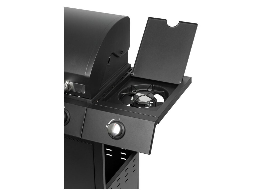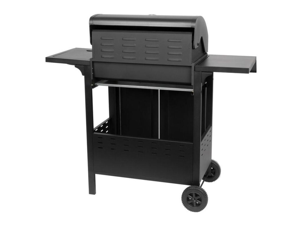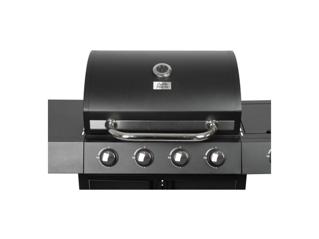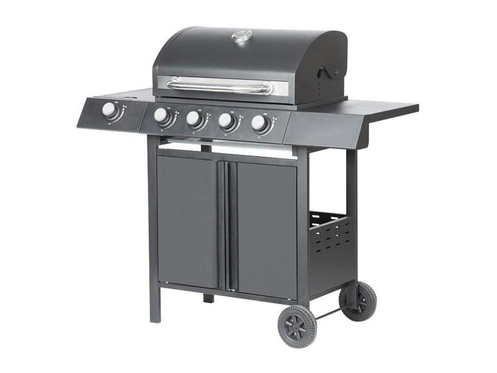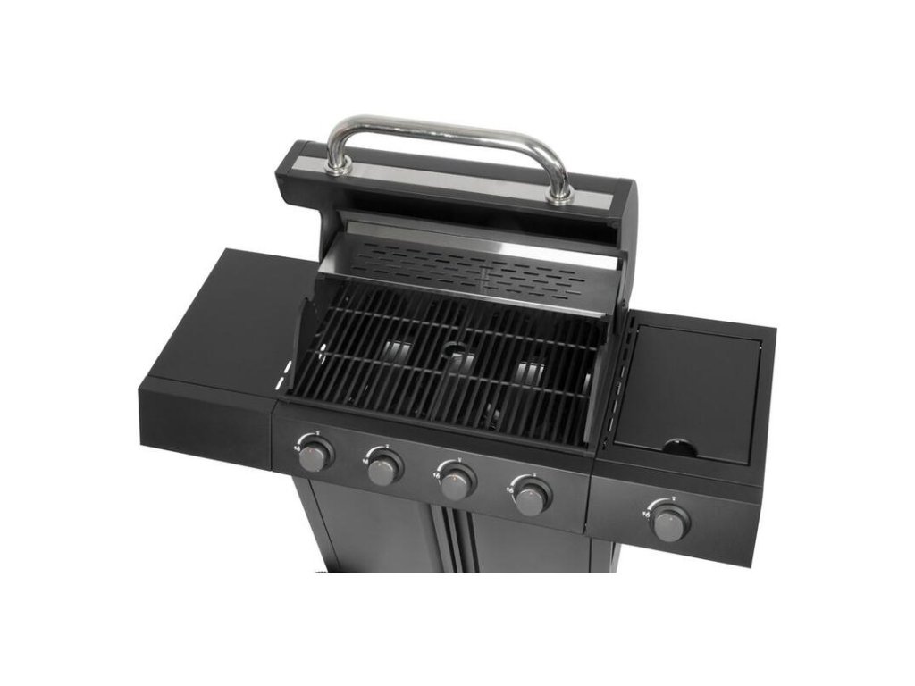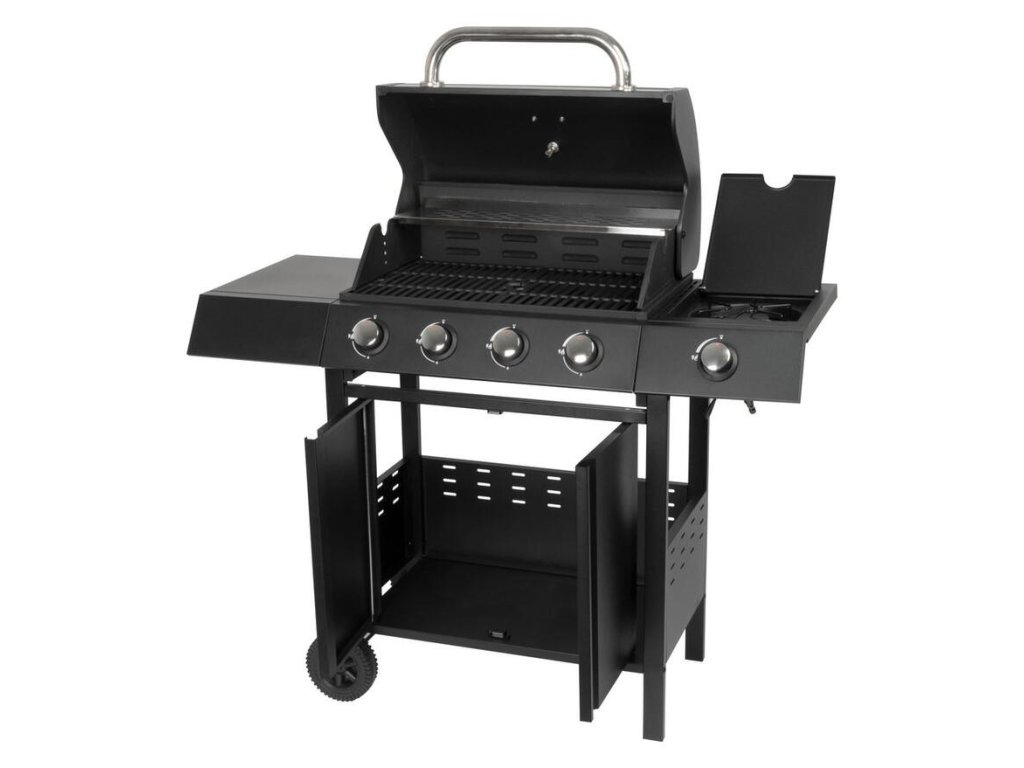 Plynový 4+1 horákový gril je ideálny na rýchlu prípravu jedál. Súčasťou je tiež jeden samostatný horák na pravej strane, pre potrebu jednoduchého varenia vonku. Na ľavej strane sa nachádza menší odkladací priestor, kde si môžeme uložiť grilovacie kliešte a pod. Hlavná grilovacia časť sa nachádza pod vrchným kovovým krytom. Varná mriežka je vyrobená zo smaltovanej ocele. Výhodou grilu je zabudovaný ukazovateľ teploty z nehrdzavejúcej ocele, vďaka čomu nemusíte jedlo neustále kontrolovať. Pod grilovacou časťou sa tiež nachádza odkladací priestor, ktorý môžete využiť na umiestnene plynovej fľaše. Pre funkčnosť grilu sa používa štandardná plynová fľaša s hmotnosťou náplne do 11 kg. Celý povrch je pokrytý krásnou práškovou čiernou farbou. Z hľadiska čistenia na tomto grile oceníte, že sa mastnota po grilovaní odstraňuje veľmi jednoducho. Rozmery grilu sú 120 x 53 x 110 cm. Hmotnosť je 28,5 kg, teda nie je ideálny na každodenné prenášanie. V prípade potreba je však podstava vybavená dvomi kolieskami, ktoré vám nutný prenos uľahčia.