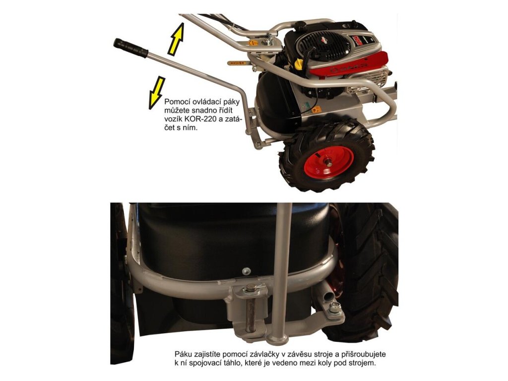 Na rozdiel od pevných vozíkov má KOR220 riadené kolesá. Pri modeli FD2 sa ovláda tyčou za riadidlami, zatiaľ čo pri FD3 sa zatáča priamo pohybom riadidiel stroja. S nosnosťou prevyšujúcou bežné koliesko až dvojnásobne preveziete drevo, prepravky alebo stavebný materiál bez ničenia vlastného zdravia a chrbtice.Hlavné vlastnosti a výhody podvozku KOR220