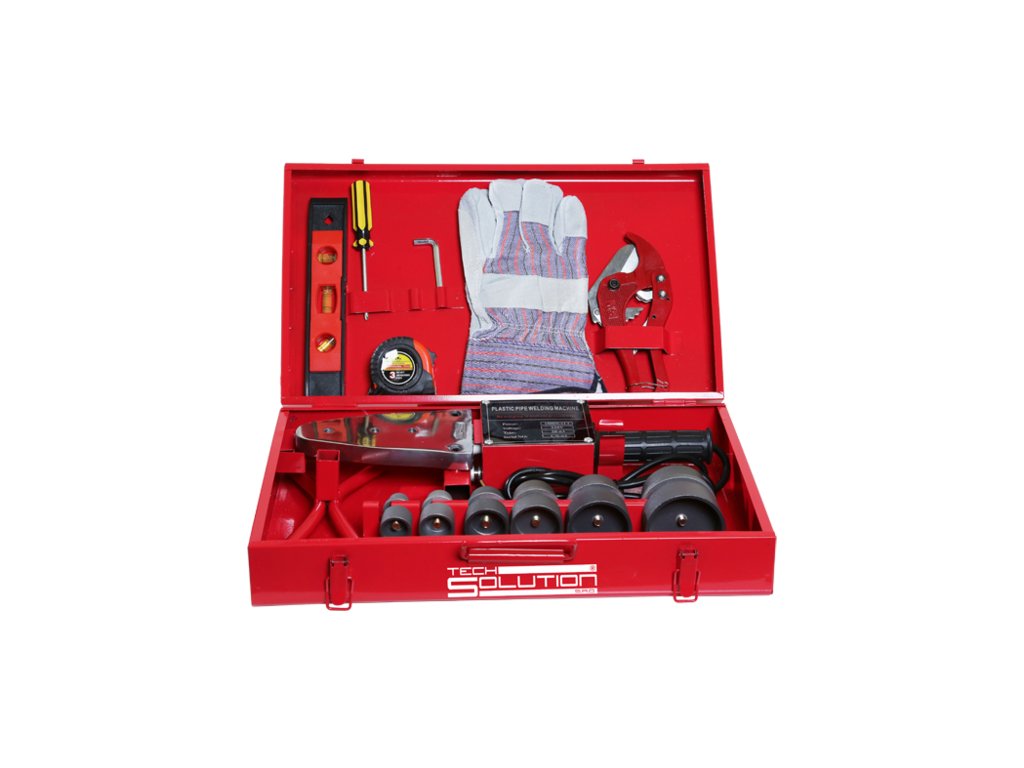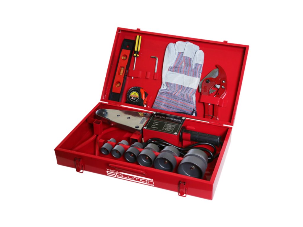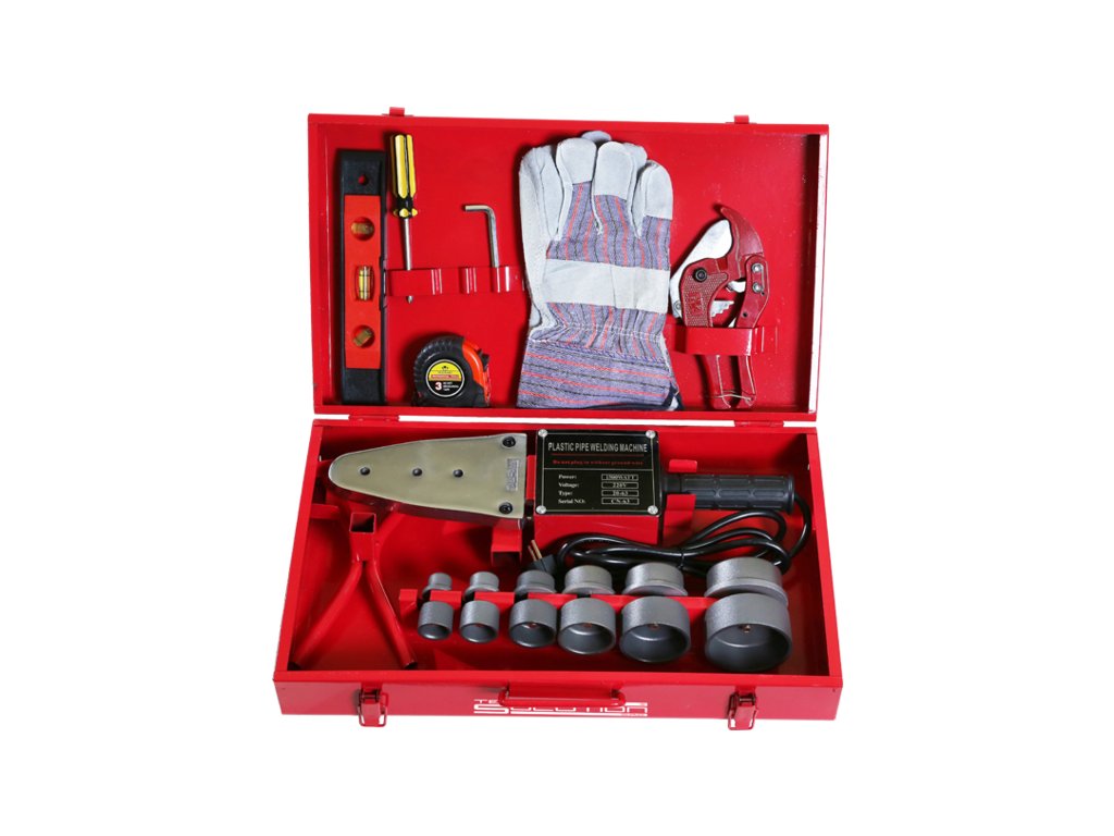 V balení nájdete zváračku, šesť kusov nástavcov, nožnice na plastové rúry, meter, rukavice, vodováhu, imbusový kľúč, skrutkovač a praktický plechový kufrík, v ktorom je celá sada prehľadne uložená. Kufrík zjednodušuje prenos a ukladanie zváračky a príslušenstva, čo je ideálne pre prácu na rôznych pracoviskách.