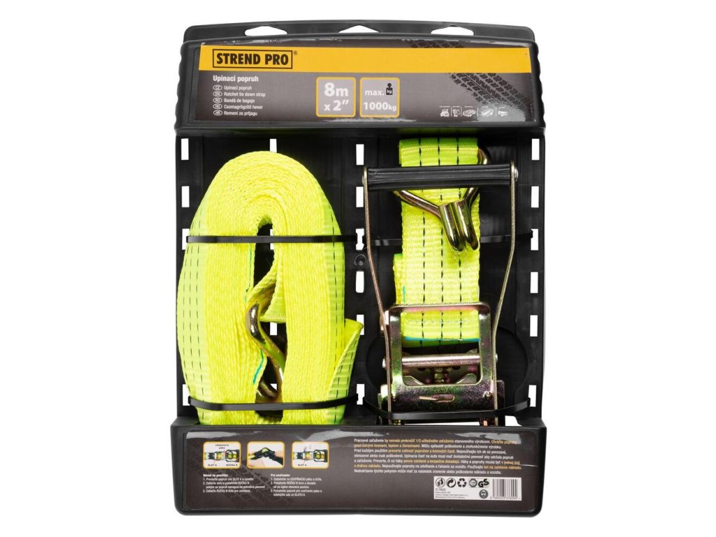 Upínací popruh Strend Pro má široké spektrum využitia. Slúži na zviazanie tovaru, zavetrovanie konštrukcií, na kotvenie stanov, koncertných stage-ov a podobne. Jeho dĺžka je 8 m a maximálna nosnosť je 1 000 kg.Technické parametre: