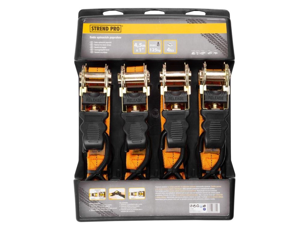 Upínací popruh Strend Pro má široké spektrum využitia. Slúži na zviazanie tovaru, zavetrovanie konštrukcií, na kotvenie stanov, koncertných stage-ov a podobne. Jeho dĺžka je 4,5 m a maximálna nosnosť je125 kg. Balenie obsahuje 4 ks.Technické parametre: