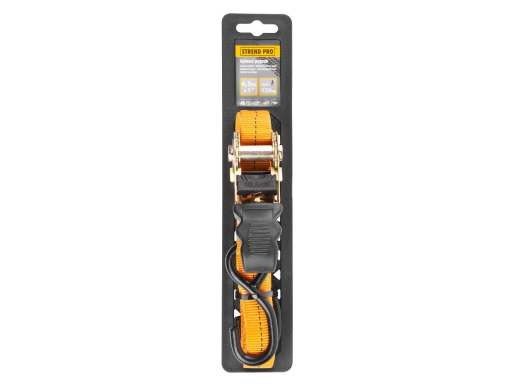 Upínací popruh Strend Pro má široké spektrum využitia. Slúži na zviazanie tovaru, zavetrovanie konštrukcií, na kotvenie stanov, koncertných stage-ov a podobne. Jeho dĺžka je 4,5 m a maximálna nosnosť je 125 kg.Technické parametre: