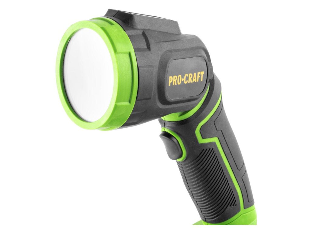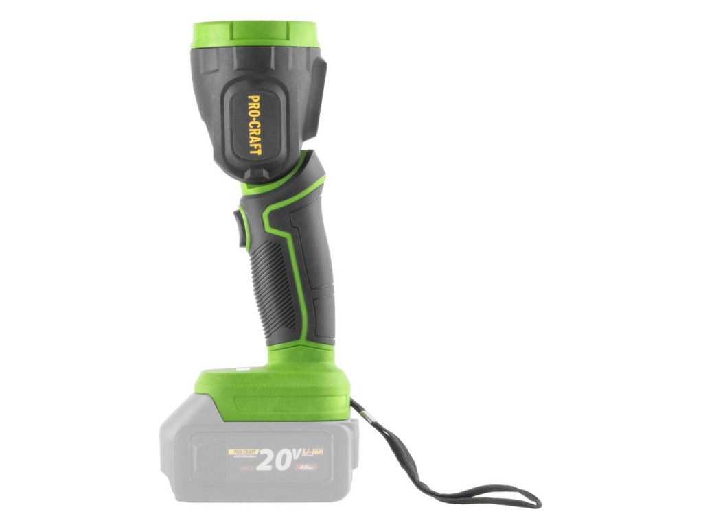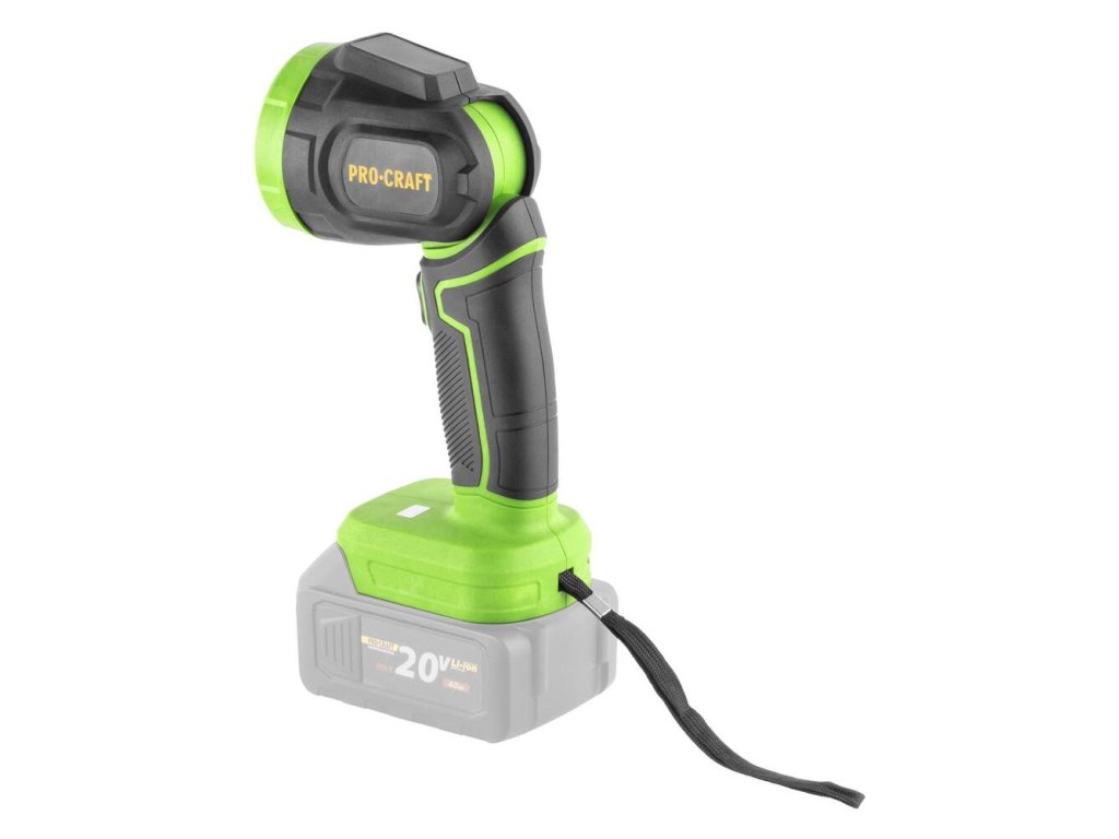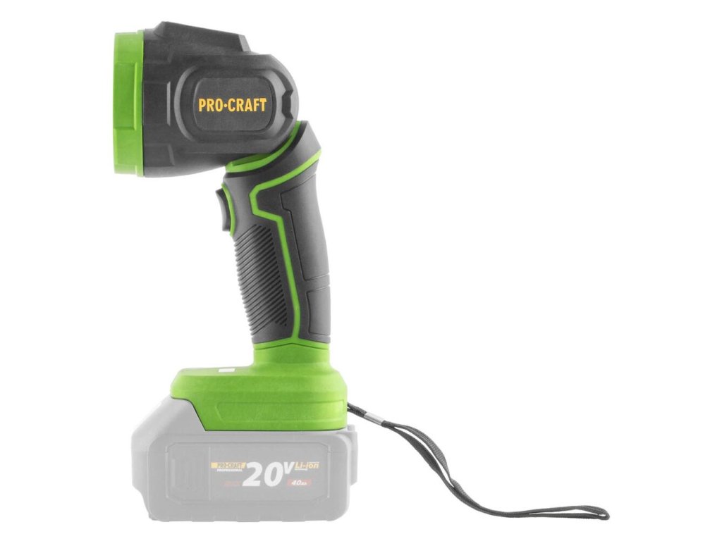 Výkonná LED lampa so svetelným tokom 300 lm poskytuje kvalitné osvetlenie. Nastaviteľný uhol držiaka (0 - 90°) umožňuje nasmerovať svetlo presne tam, kde je potrebné. Nízka hmotnosť (0,25 kg bez batérie) na pohodlné prenášanie a jednoduchú manipuláciu. Kompatibilný s 20 V lítium-iónovými batériami Procraft s kapacitou 2,0 / 4,0 / 8,0 Ah.