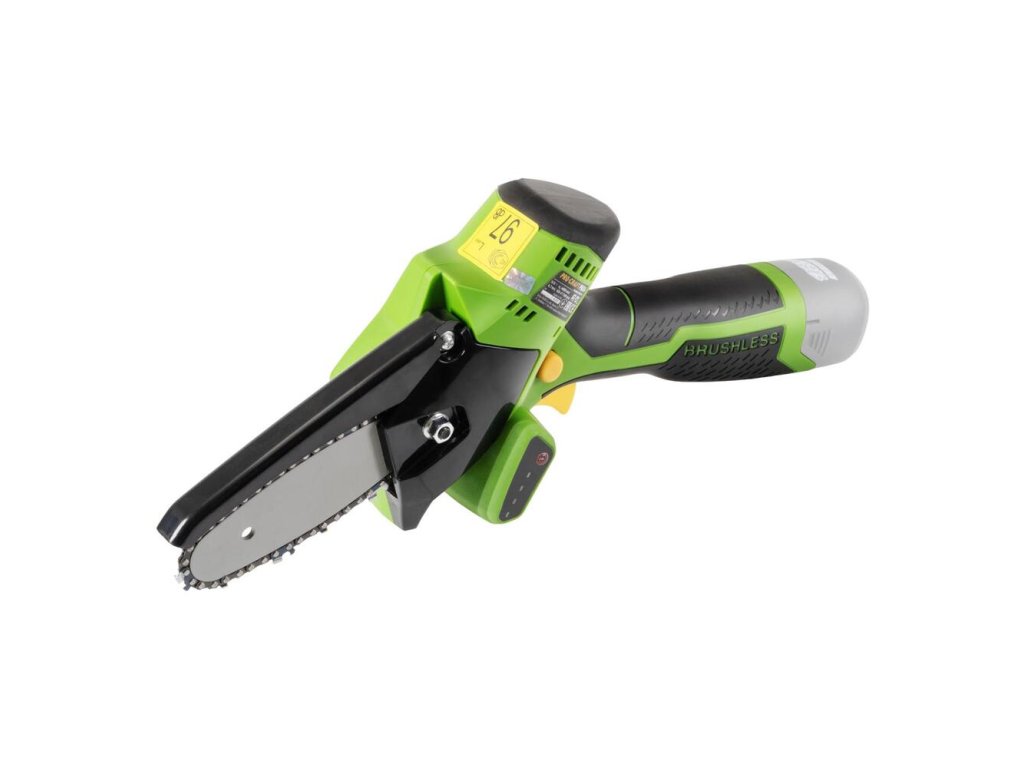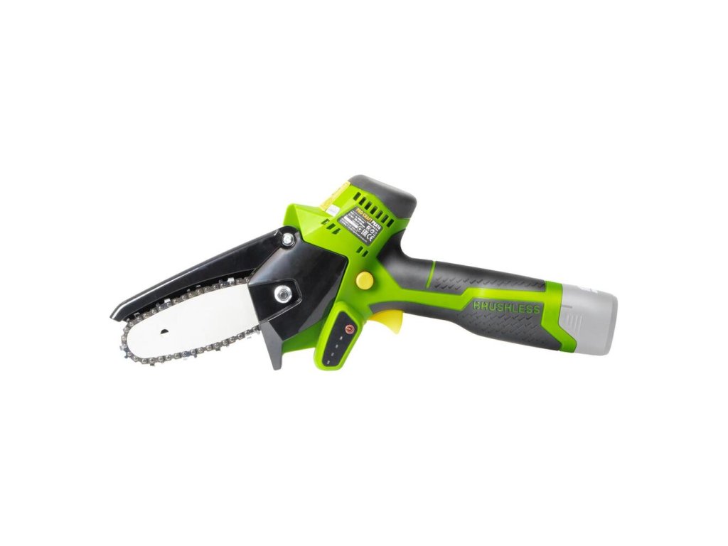 Jednoruká reťazová píla AKU je vďaka svojim kompaktným rozmerom užitočným nástrojom na prerezávanie stromov a kríkov v stiesnených priestoroch. Jej prevádzka je v porovnaní s väčšími strojmi tichá. Vybavená je bezpečnostným krytom reťaze. Stroj sa dodáva kompletne s vodiacou lištou a reťazou píly v kartóne s montážnym kľúčom, nádobou na mazací olej.