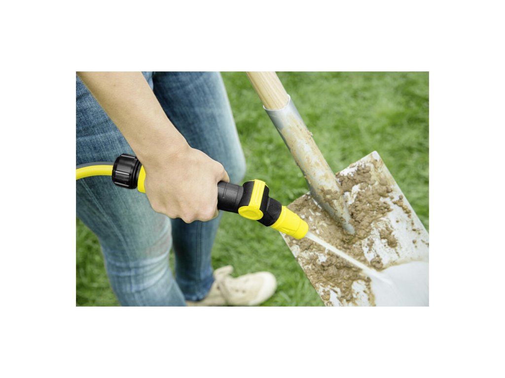 Regulovateľný postrekovač má jednoručne ovládateľný regulačný ventil, pomocou ktorého sa dá palcom jednoducho prispôsobovať prietok vody. Ďalej je možné podľa potreby plynulo nastavovať 2 tvary rozstrekovaného prúdu: bodový a kužeľový prúd. Takto jednoducho môžete zavlažovať kvetinové a rastlinné záhony, a súčasne aj oslobodiť terasy a záhradný nábytok od hrubej špiny. Preto sa tento regulovateľný postrekovač veľmi dobre hodí na zavlažovanie ako aj na čistenie. Počas prestávok v polievaní je možné prietok vody jednoducho zatvoriť pomocou regulačného ventilu. Mimochodom: Postrekovače Kärcher sú kompatibilné s všetkými dostupnými klik systémami a dajú sa ľahko napojiť na záhradnú hadicu.