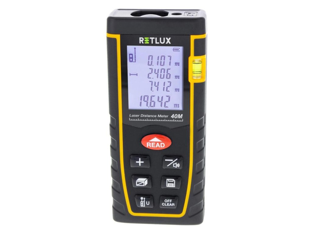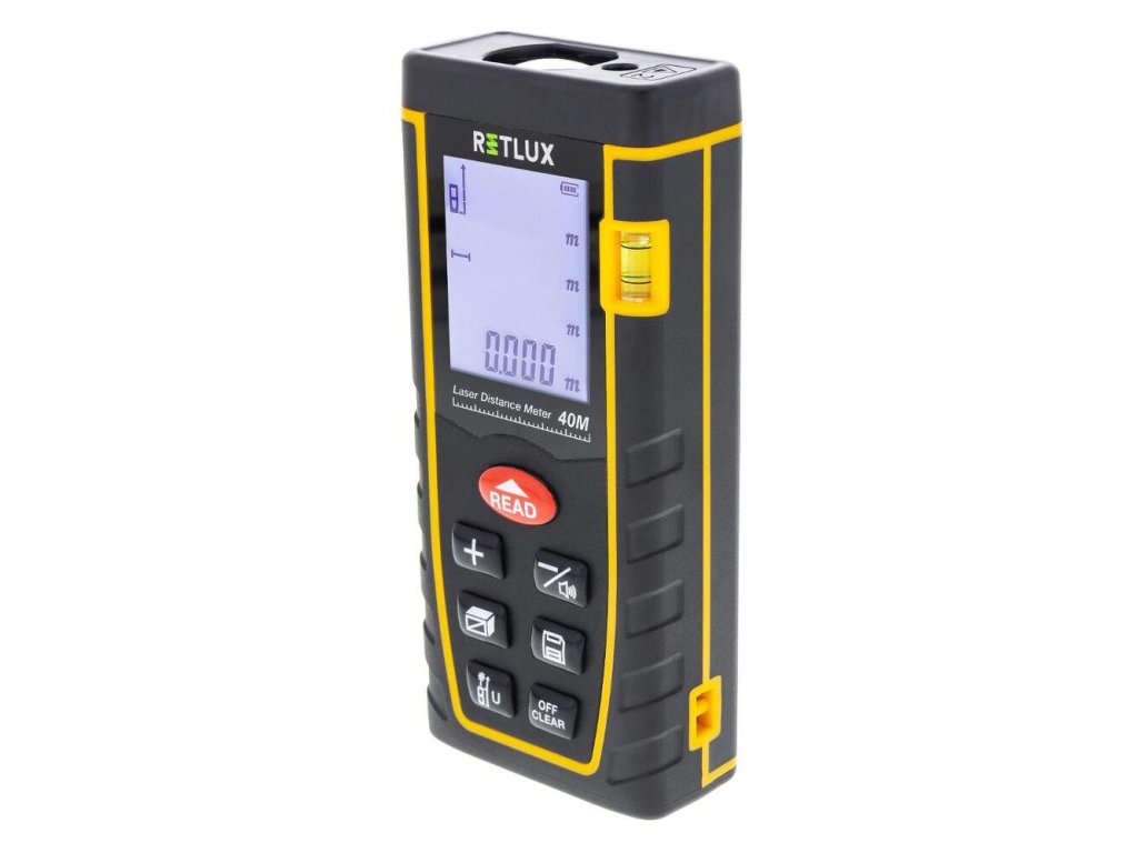 - Laserový diaľkomer s dĺžkou merania až do 40 metrov s funkciami merania dĺžky, objemu, obsahu, merania s využitím dvoch referenčných bodov a pamäťou na 30 meraní.