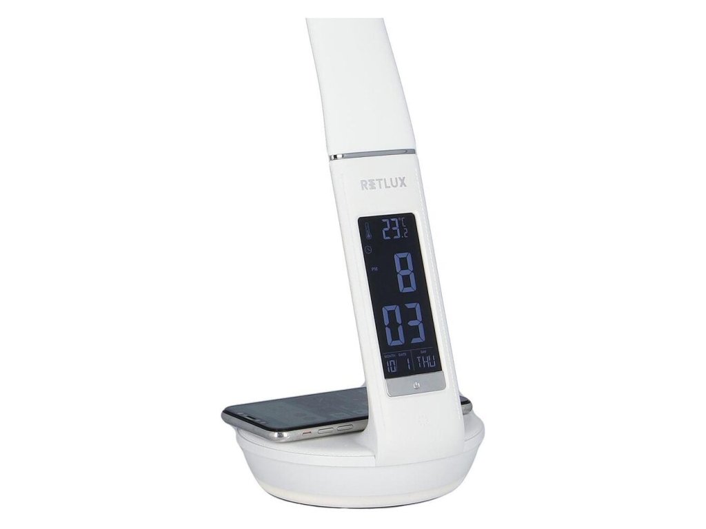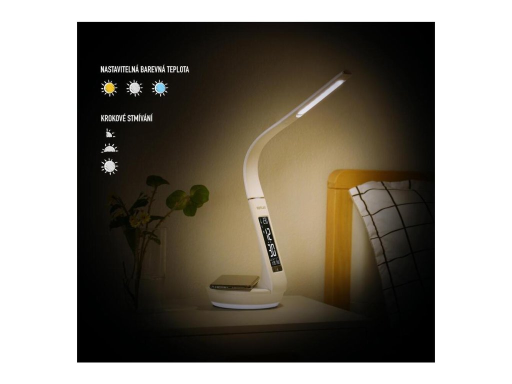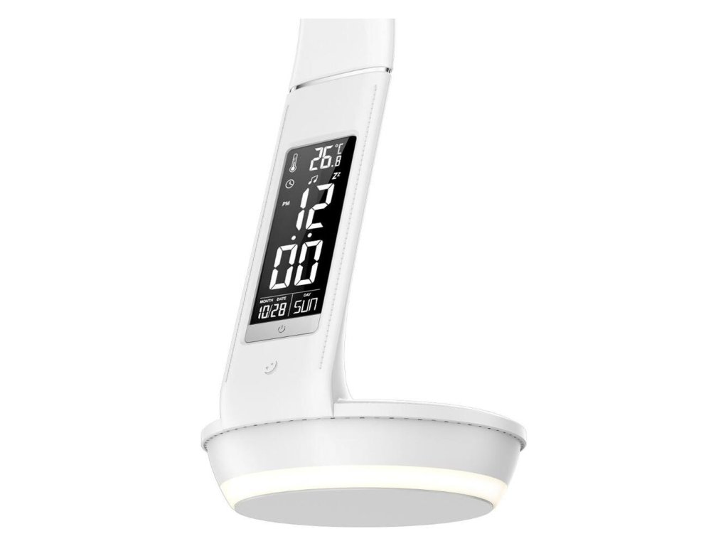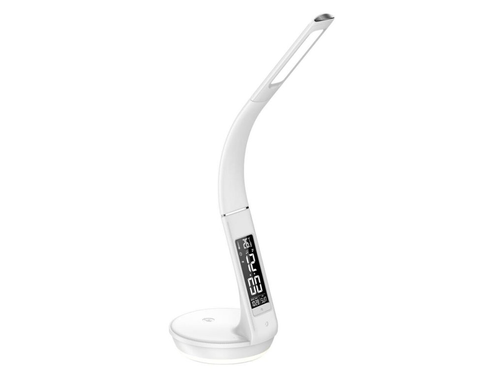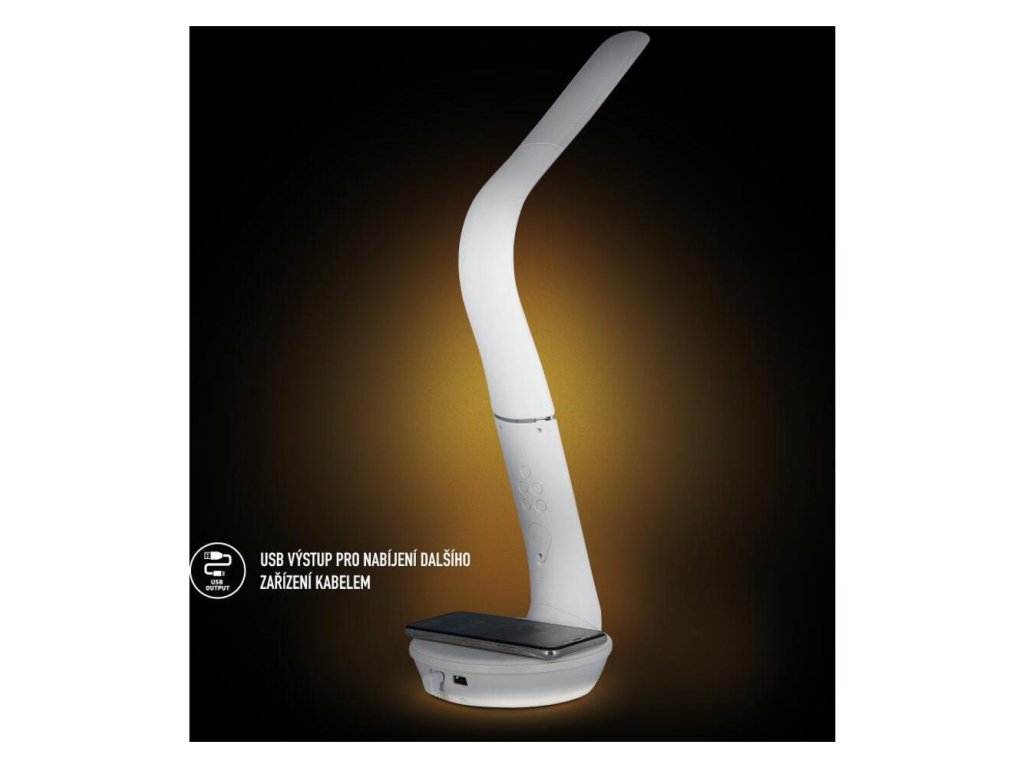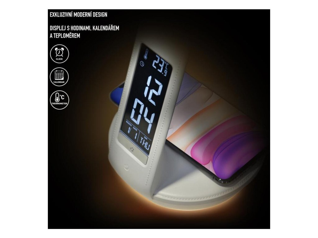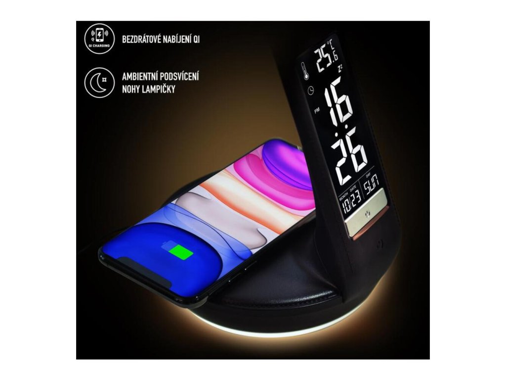 - LED stolná lampička s ambientným podsvietením, hodinami, kalendárom, teplomerom, bezdrôtovým nabíjaním Qi a USB výstupom.