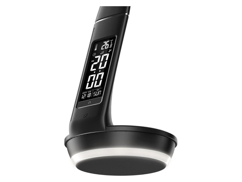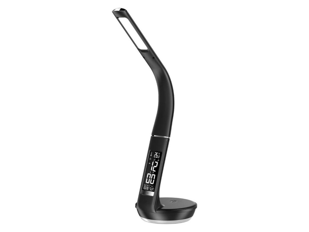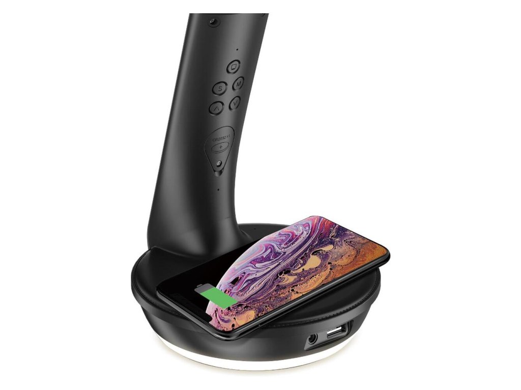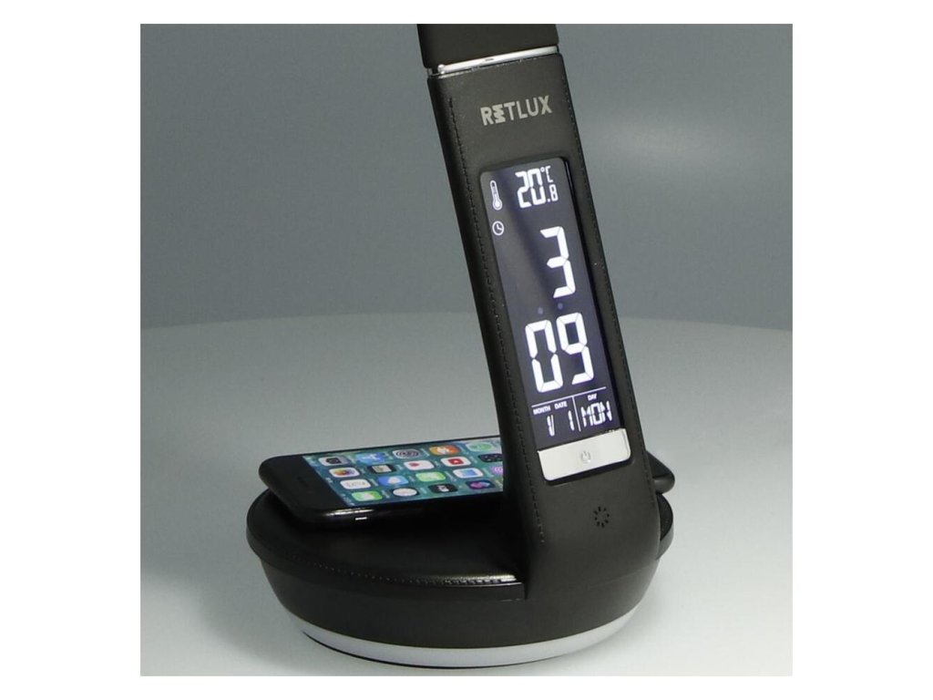 - LED stolná lampička s ambientným podsvietením, hodinami, kalendárom, teplomerom, bezdrôtovým nabíjaním Qi a USB výstupom.