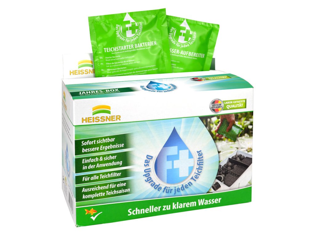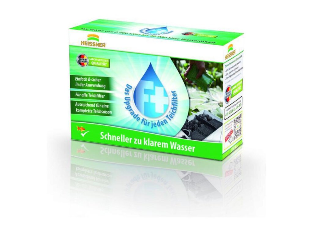 Jedno balenie F+ s 10 vreckami vystačí na celú sezónu /od jari do jesene/. Jednoduchá aplikácia - každé 3 týždne nasypte obsah vrecka priamo do filtra. Obsahuje 7x kondicionér vody, ktorý nastavuje správne hodnoty pH a tvrdosti, čo je dôležité, ak je voda príliš mäkká, potom filtračné baktérie nefungujú. Obsahuje 3x štartovacie filtračné baktérie, tie sa usadzujú vo filtri a prijímajú živiny pre riasy v jazierku. V dôsledku zrážok a vonkajších vplyvov sa hodnoty vody v jazierku menia a môžu ovplyvniť kvalitu vody, ale so súpravou HEISSNER F-PLUS obídete možné problémy.