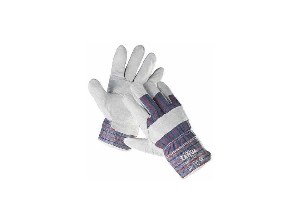 - kombinované rukavice- vystužená dlaň zo šedej hovädzej štiepenky - chrbát a manžeta z pruhovanej bavnenej tkaniny