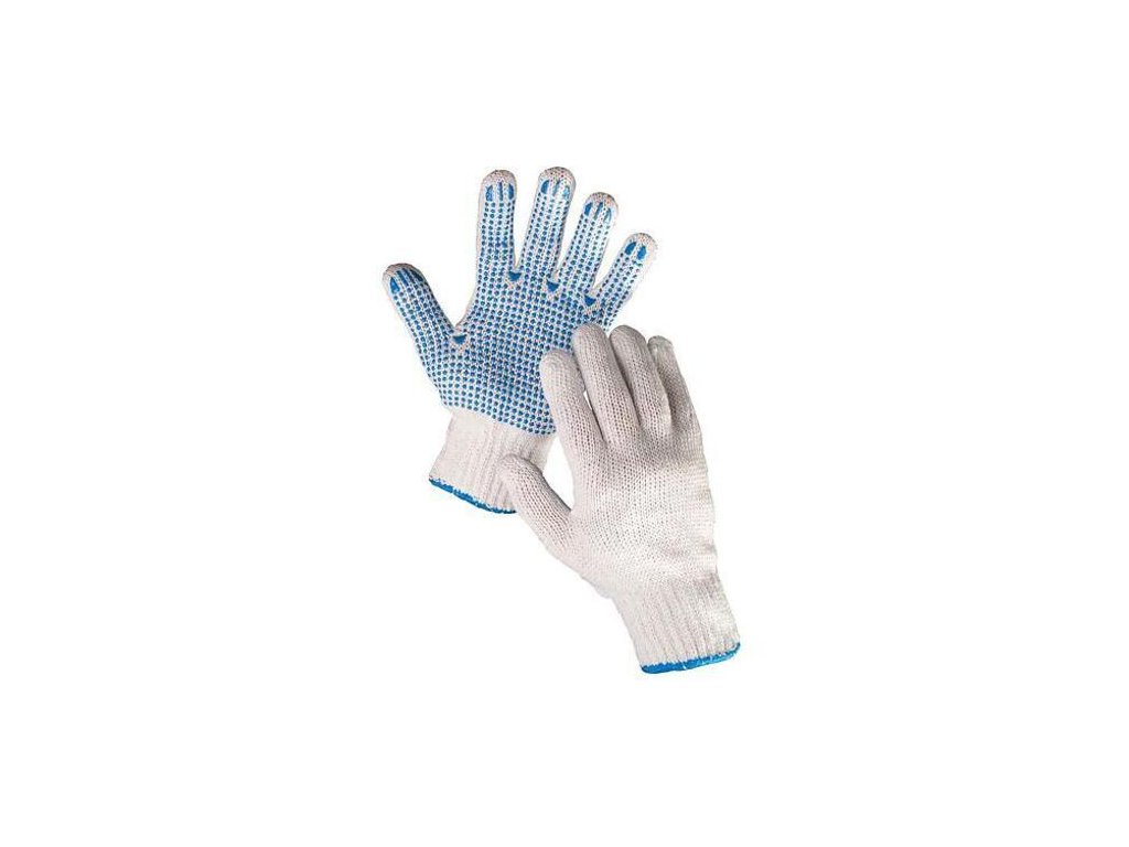 - bezšvový biely polyesterový úplet s pružným zápästímdlaň a prsty s modrými PVC terčíkmi.