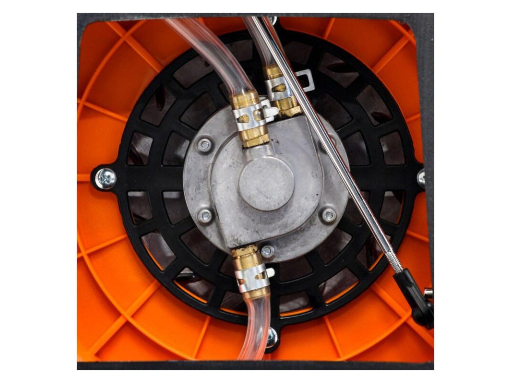 Tlaková pumpa, ktorou je rosič RURIS A103S vybavený, umožňuje rozprašovanie pri 90 stupňoch a kontrolovaný tlak prúdu roztoku.