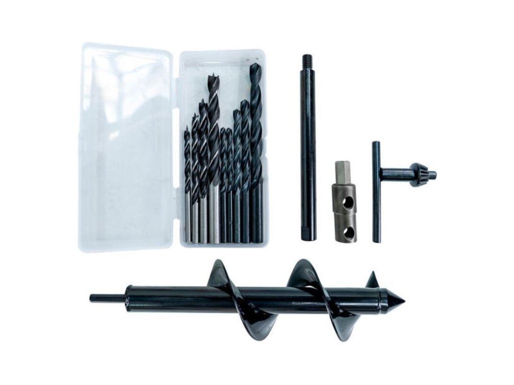 Dodávaná súprava vrtákov obsahuje zemný vrták s rozmermi 80 x 300 mm, ktorý je ideálny na vŕtanie otvorov do zeme, čím uľahčuje prácu v záhrade alebo po inštalácii.