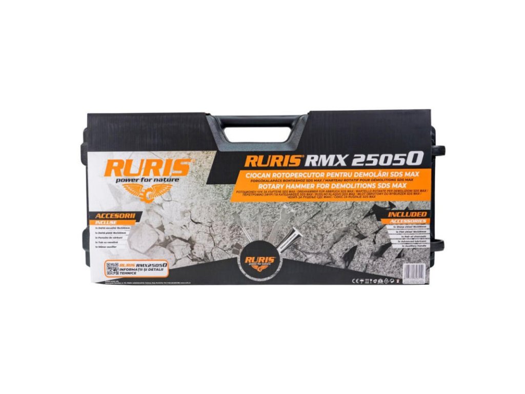 Demolačné rotačné kladivo SDS MAX RURIS RMX25020 je vysokovýkonné elektrické náradie určené na vykonávanie demolačných prác v rôznych tvrdých materiáloch ako je betón, murivo a kameň.