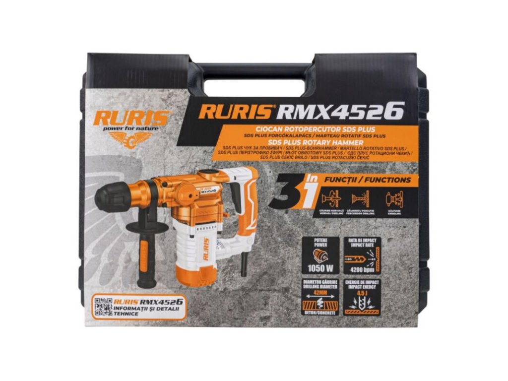 Rotačné kladivo RURIS RMX4526 SDS Plus je výkonný nástroj, ideálny pre stavebné a renovačné práce, ktoré si vyžadujú vŕtanie a sekanie do tvrdých materiálov ako je betón.