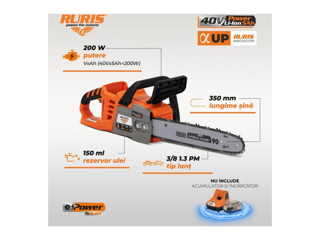 Vďaka absencii napájacieho kábla a výkonnej a ľahkej batérie môžu používatelia rezať drevo kdekoľvek bez toho, aby boli obmedzovaní prítomnosťou zdroja energie alebo obmedzenou dĺžkou kábla. Li-Ion batéria je tiež nabíjateľná, vďaka čomu je používanie akumulátorovej reťazovej píly RURIS RM3545e ekonomickejšie a pohodlnejšie ako iné modely na trhu.