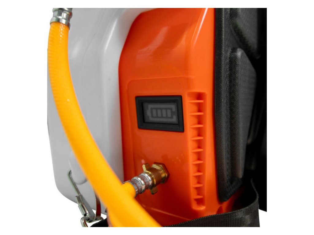 Zariadenie je vybavené LED displejom, ktorý zobrazuje dôležité informácie o stave nabitia batérie a prevádzke postrekovača. Tento prvok poskytuje používateľovi bezpečnosť a kontrolu počas celého používania.