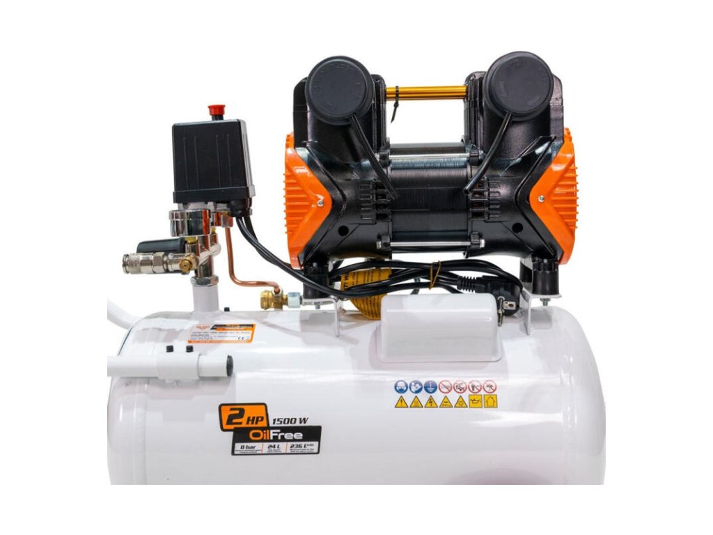 Bezolejový kompresor RURIS Silent Power 24000 je vybavený ochranou proti prehriatiu a ochranou proti preťaženiu, čo sú dve základné funkcie pre bezpečnosť pri používaní. Tieto systémy zabraňujú poškodeniu motora v prípade intenzívneho používania alebo nepredvídaných podmienok, čím zabezpečujú dlhšiu životnosť.