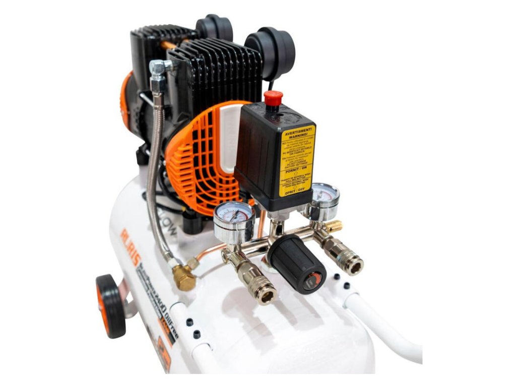 Dva výstupy bezolejového kompresora RURIS Silent Power 24000 , každý vybavený samostatným manometrom, umožňujú súčasné použitie dvoch pneumatických nástrojov s nezávislým nastavením tlaku. Tento systém ponúka zvýšenú flexibilitu pri práci a šetrí čas, pričom je ideálny pre rôzne úlohy vykonávané paralelne.