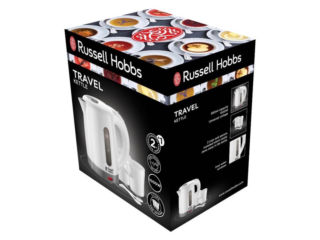 Kanvica vhodná na cestovanie, vrátane 2 šálok a lyžičiek, ktoré môžu byť skladované vo vnútri kanvice, 1 000 W, kapacita 0,85 l, ochrana pred chodomnasucho, skryté výhrevné teliesko, odnímateľný umývateľný filter, univerzálne napätie