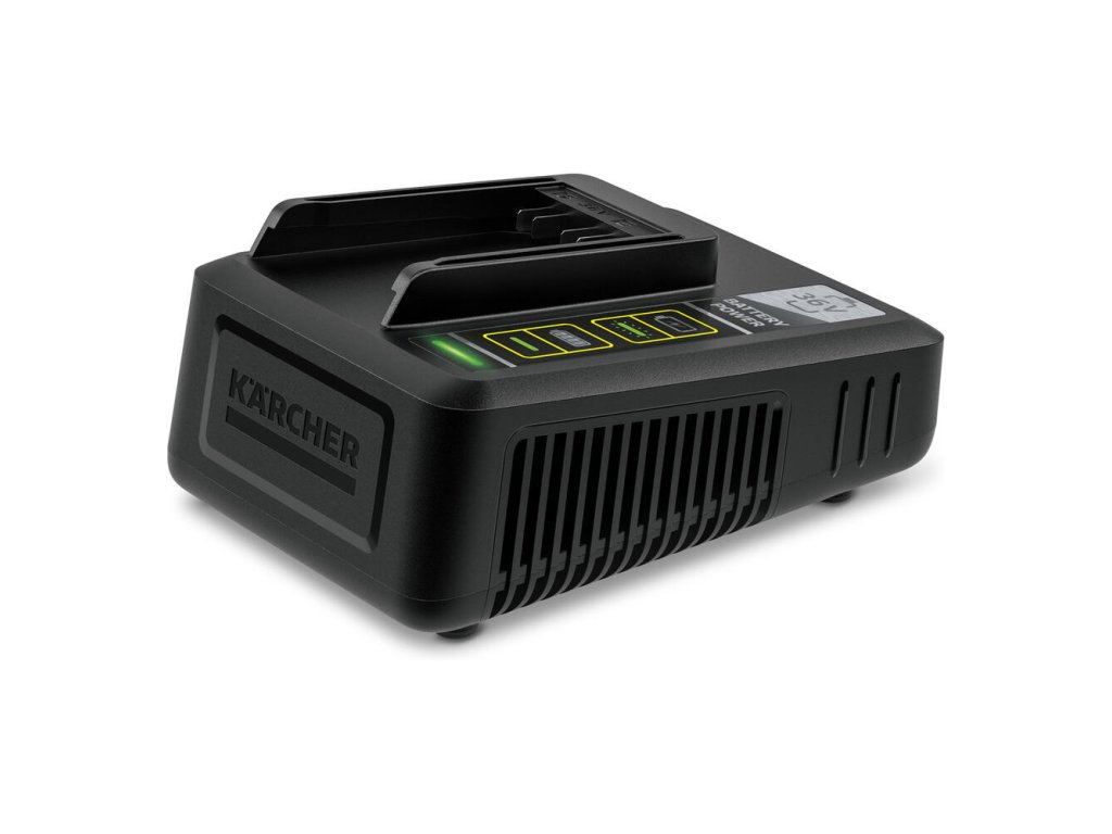 Rýchlonabíjačka pre všetky 36 V vymeniteľné batérie systému 36 V vymeniteľných batérií Battery Power značky Kärcher navráti každej batérii plný výkon za veľmi krátky. Vymeniteľnú batériu 36 V / 2,5 Ah Kärcher Battery Power nabije napríklad na 80 % iba za 45 minút. Nabíjačka má okrem toho integrovaný nástenný držiak.