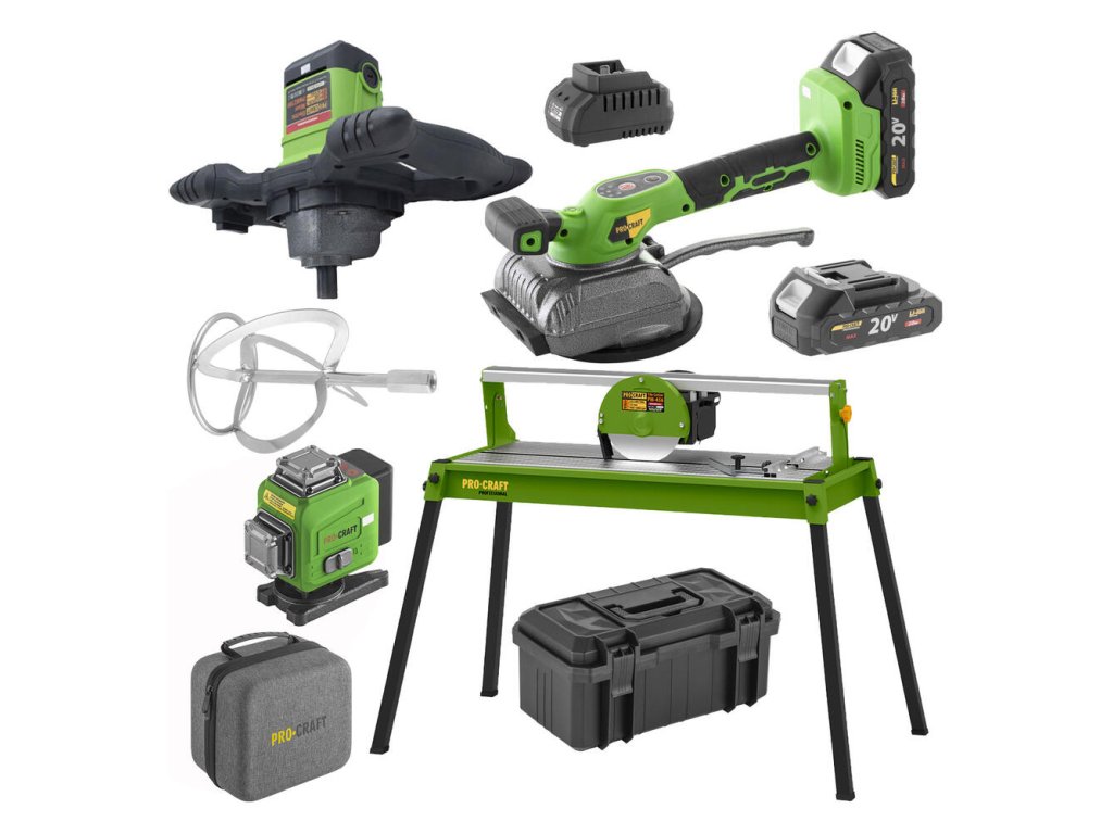 Súčasťou sady je elektrická rezačka ProCraft PF720-200, ktorá ponúka nielen príkon 800 W, ale aj možnosť rezania pod uhlom až 45°. Táto rezačka je ideálna na spracovanie keramických obkladov a dlaždíc, pričom zabezpečuje čisté a opakovateľné rezy. Stabilita pracovného stola s rozmermi 990 × 394 mm ponúka komfort a presnosť pri práci.