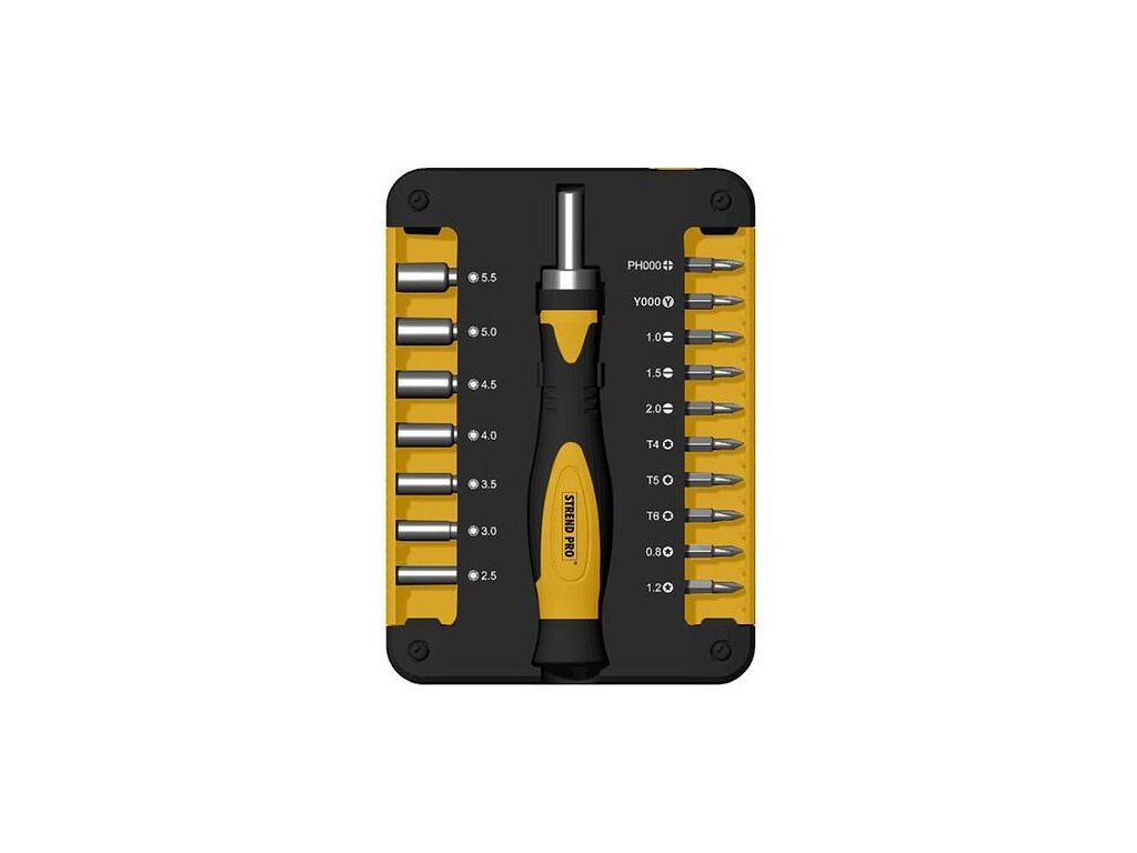 Sada bitov a hlavíc Strend Pro by nemala chýbať vo výbave vašej dielne. Sada pozostáva zo skrutkovača, držiaka, pozdlžnych bitov (1-1,5-2 mm), krížových bitov (PH000, Y000), šesťhranných bitov (2,5-3-3,5-4-4,5-5-5,5) a hviezdicových bitov - päťcípych (0,8-1,2) a šesťcípych (T4,T5,T6).