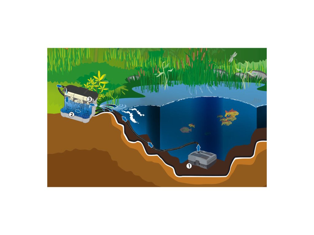 Prietoková filtračná súprava je určená pre jazierka do 8 m³ bez rýb a 4 m³ s rybami. Ide o prietokovú filtráciu s vysokým biologickým rozsahom. Čerpadlo sa jednoducho umiestni do jazierka a pripojí sa k filtračnej nádobe umiestnenej na brehu jazierka. Čerpadlo umiestnite na opačnú stranu filtračného systému, aby voda prirodzene cirkulovala. Čerpadlo je vybavené 9 W UV lampou na riasy a veľkou sacou plochou, ako aj lavagranulátom a filtračnou špongiou na usadzovanie filtračných baktérií (funguje ako predfilter). Predčistená voda sa potom dopraví do filtračnej jednotky, ktorá je vybavená filtračnými materiálmi na uchytenie filtračných baktérií (domčeky, filtračná špongia), tu prebieha mechanické a biologické čistenie. Vďaka trojkomorovému systému sa dosahuje lepší výsledok filtrácie. Po prefiltrovaní sa voda cez výpust vracia späť do jazierka.