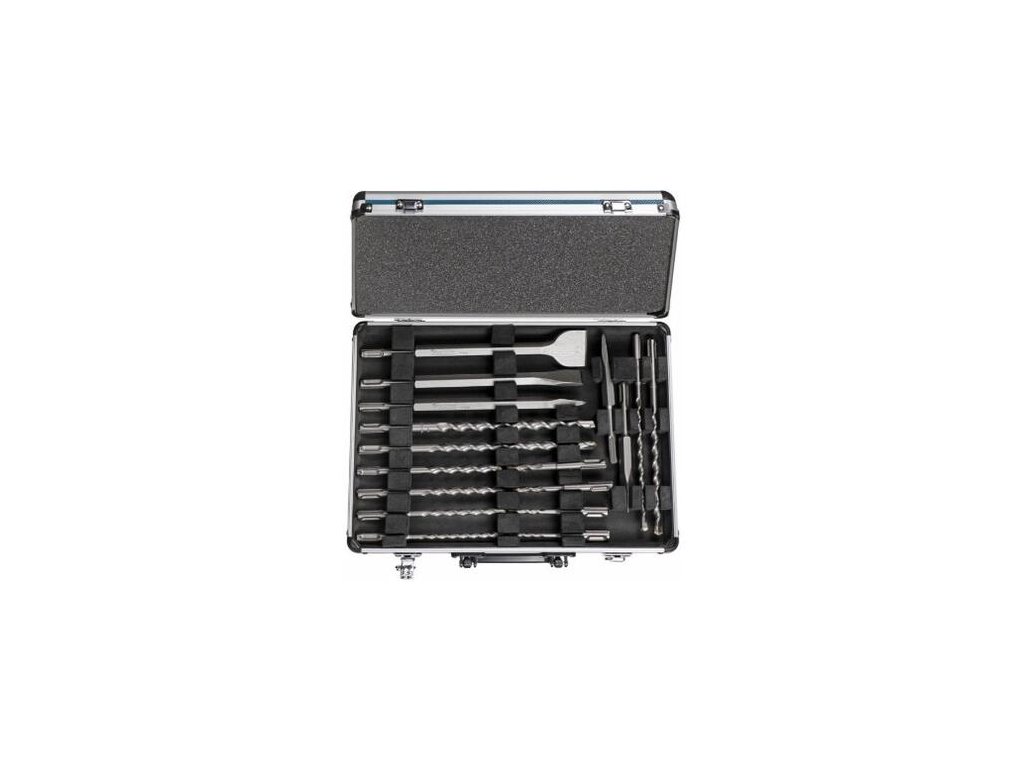 - Vrtáky SDS-Plus (12 ks): Ø5x110, Ø6x110, Ø6x160, Ø8x110, Ø8x160, Ø8x210, Ø10x110, Ø10x160, Ø10x210, Ø12x160, Ø12x260, Ø14x260 mm