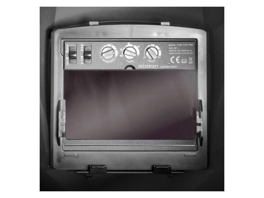 Technické údaje pre zváraciu masku Typ samostmievacej jednotky YXE-718I PRO Materiál Vysoko odolný polyamid nylon Farba kukly Lesklá čierna Lesklá čierna s logom TECH SOLUTION Odtieň filtra Priehľadný odtieň so sivou ultračistou technológiou - True Color LCD Regulácia zatmavenia DIN 5 až 8 / DIN 9 až 13 nastavenie vnútorným otočným gombíkom + režim brúsenia DIN 4 Nastavenie času prepnutia tma/svetlo Plynule pomocou otoč. gombíka od 0,1 do 1,0 sec. Nastavenie času prepnutia svetlo/tma 0,040 ms Nastavenie citlivosti na oblúk Plynulo pomocou otoč. gombíka Rozmery priezoru 100 x 53 mm Počet senzorov 4 nezávislé oblúkové snímače Optická kvalita CE EN379 1/1/1/2 Napájanie Vymeniteľná batéria CR2032 v kombinácii so solárnym článkom