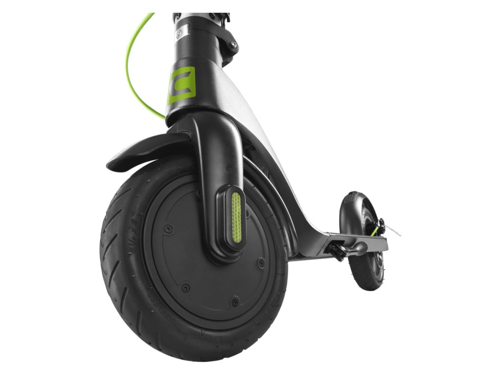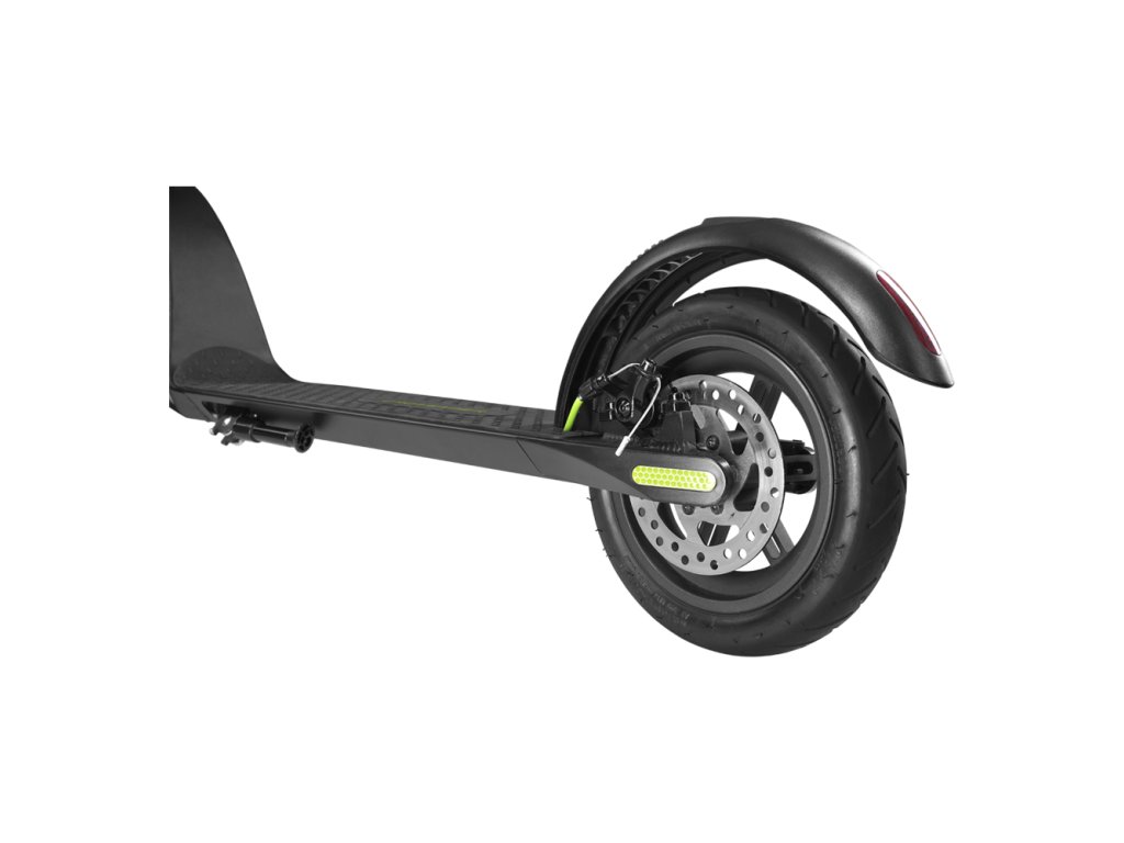 Li-Ion akumulátor s kapacitou 6,4 Ah ponúka dojazd až 25 km. Ak plánujete vyraziť na dlhší výlet, je možné zaobstarať náhradný akumulátor, ktorý zdvojnásobí vzdialenosť vašej trasy. Veľké 10 palcové kolesá oceníte najmä pri jazde na nerovnom povrchu a v teréne. Sú vysoko odolné, perfektne tlmia nárazy, minimalizujú riziko defektu a dodávajú kolobežke vyššiu stabilitu. Pevný oceľový rám sa podieľa na celkovej nosnosti kolobežky, ktorá dosahuje 120 kg, a spoločne so širokou nášľapnou doskou sú zárukou vysokej kvality a komfortnej jazdy.