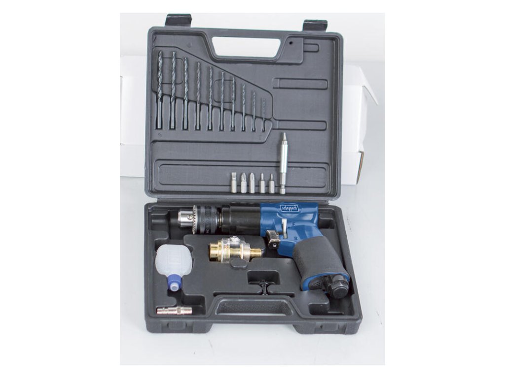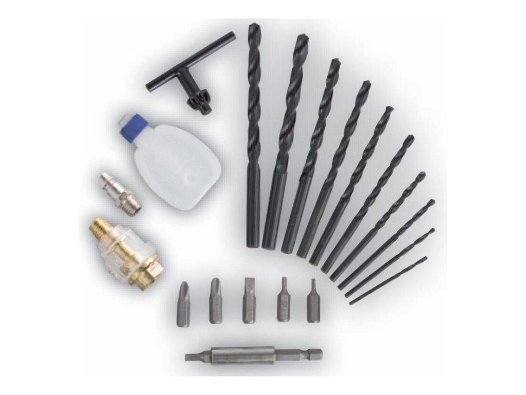 Príslušenstvo: 10 x vrták HSS, 6 x vrták CrV, 1 x držiak vrtáka, mazadlo, olej, skľučovadlo, rýchlospojka, olejový mazací strojček