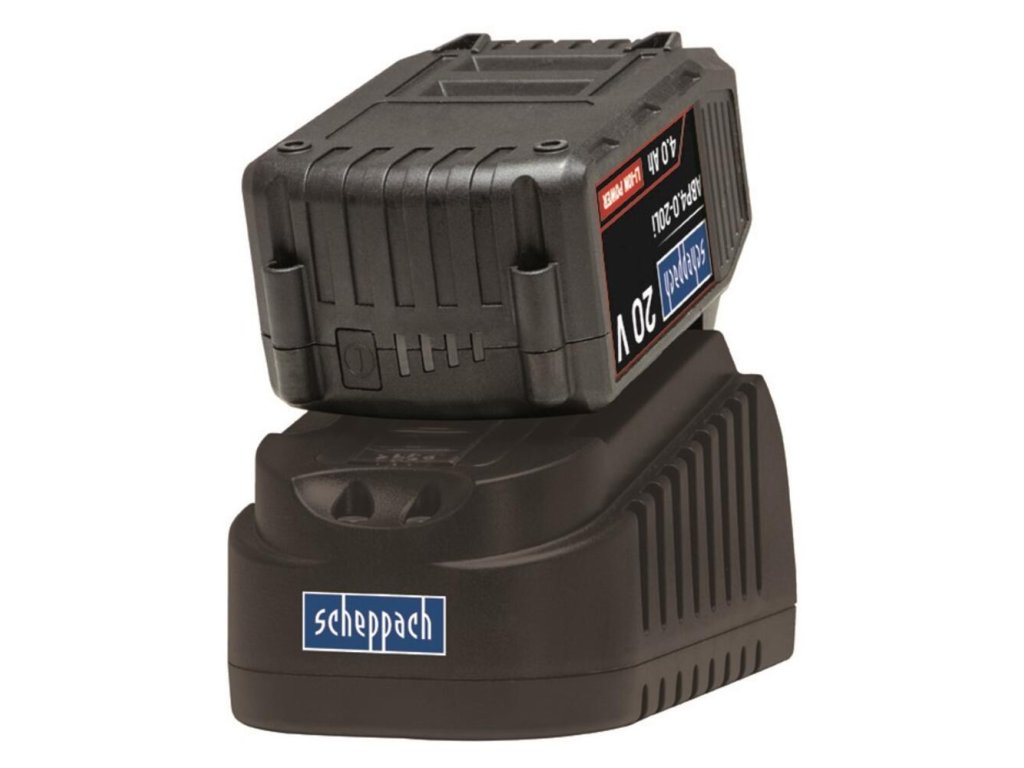 Obsahuje rýchlonabíjačku Scheppach BFC4-20Li a lítium-iónový akumulátor Scheppach ABP4.0-20Li s kapacitou 4 Ah.
