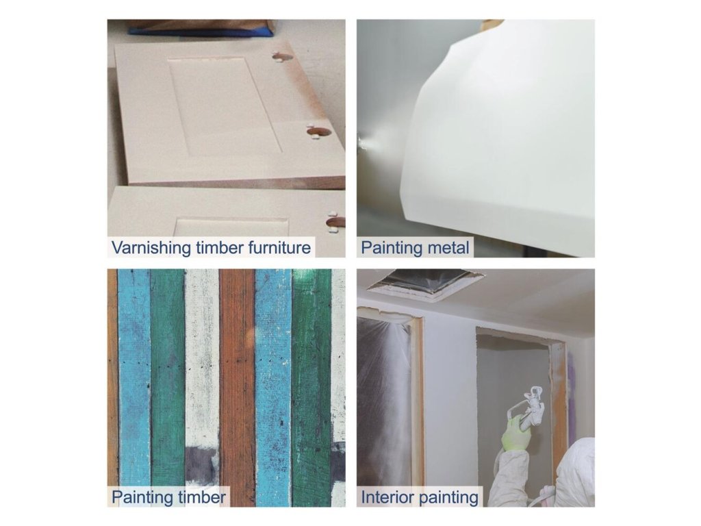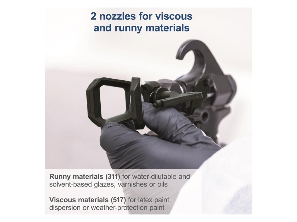 Stroj obsahuje dve trysky na viskózne aj tekuté materiály, vďaka čomu je vhodný na viskózne alebo tekuté farby, latex, laky a vodou riediteľné laky, poveternostným vplyvom odolné nátery, moridlá atď.