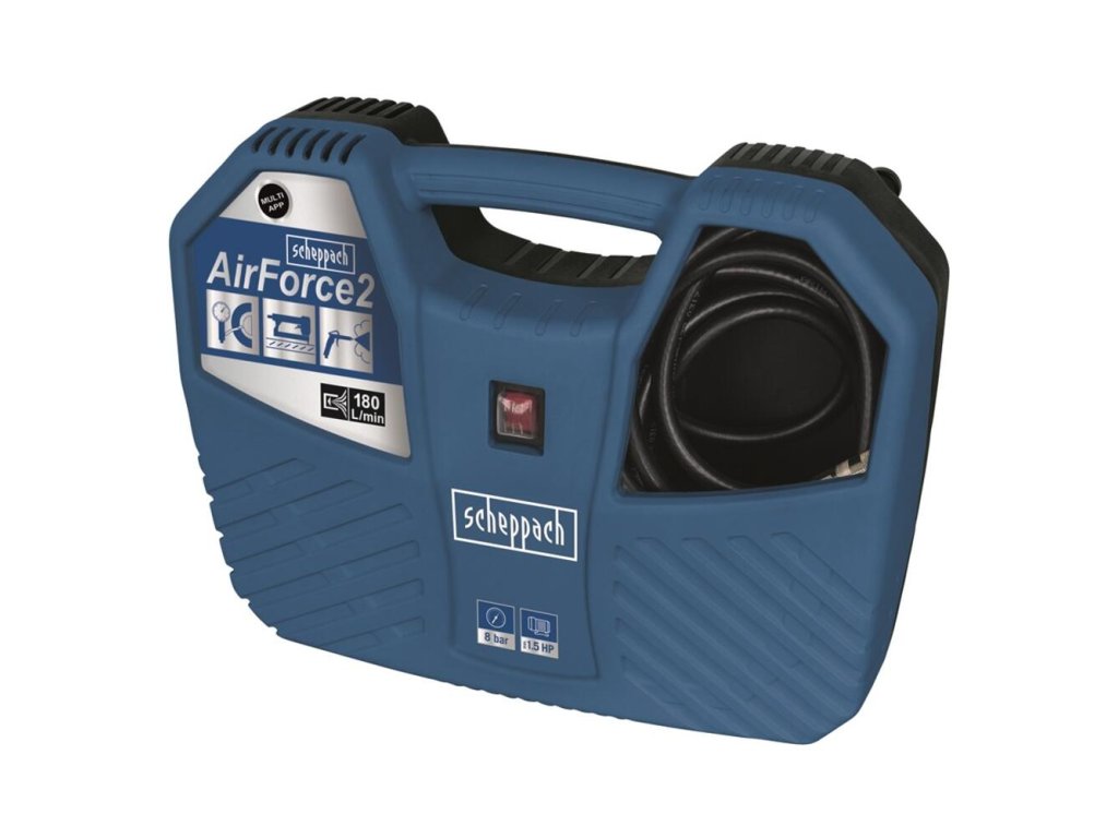 Kompresor Scheppach AIR FORCE 2 je praktický, kompaktný, ľahký, výkonný a dobre vybavený pomocník vhodný do každej domácnosti, chaty, karavanu alebo lode.Vďaka veľkému počtu rôznych trysiek, výkonnému motoru a vysokému pracovnému tlaku zvládne fúkanie pneumatík motocyklov, bicyklov, automobilov, štvorkoliek, lôpt, matracov, nafukovacích člnov, raftov atď.