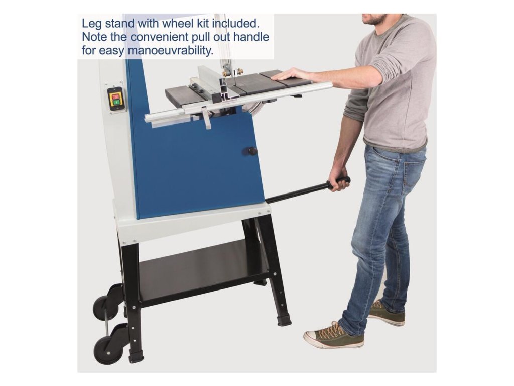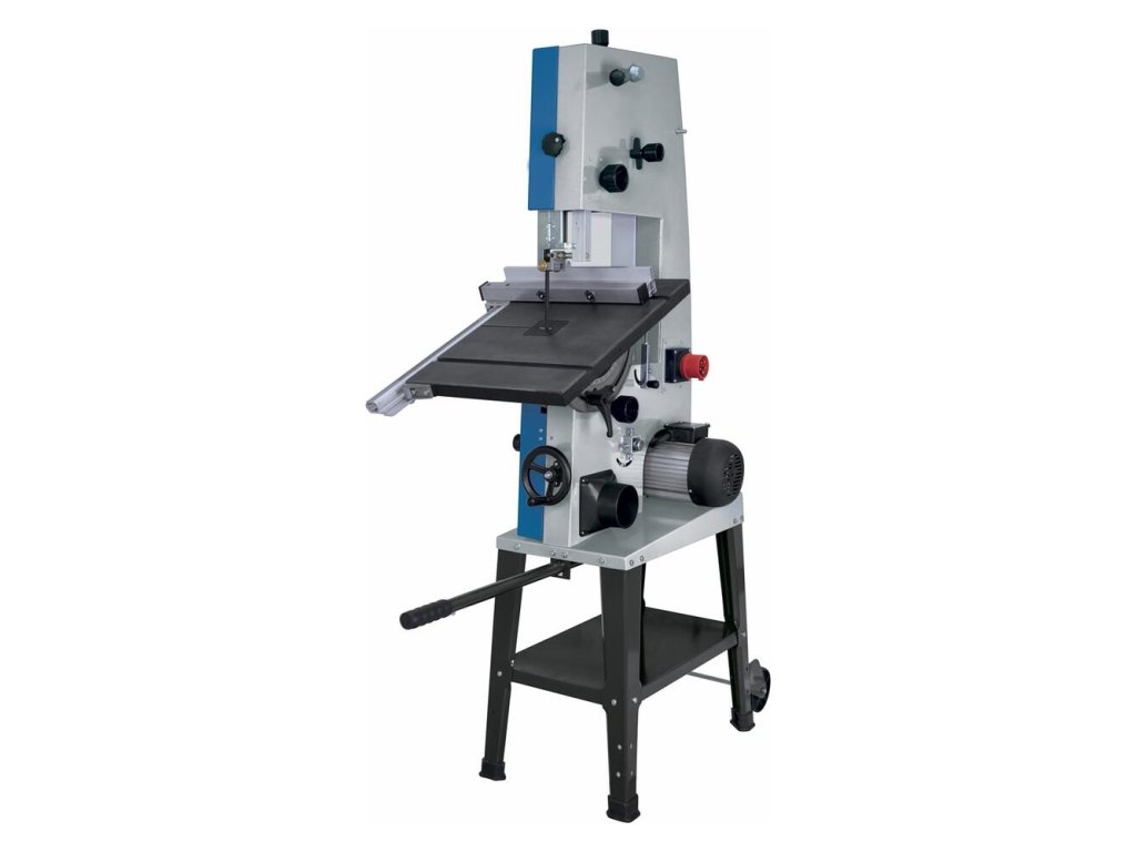 Pásová píla je vybavená aj konektorom na pripojenie odsávača pilín a robustným stojanom s kolieskami a výsuvnou pákou na jednoduchú prepravu.